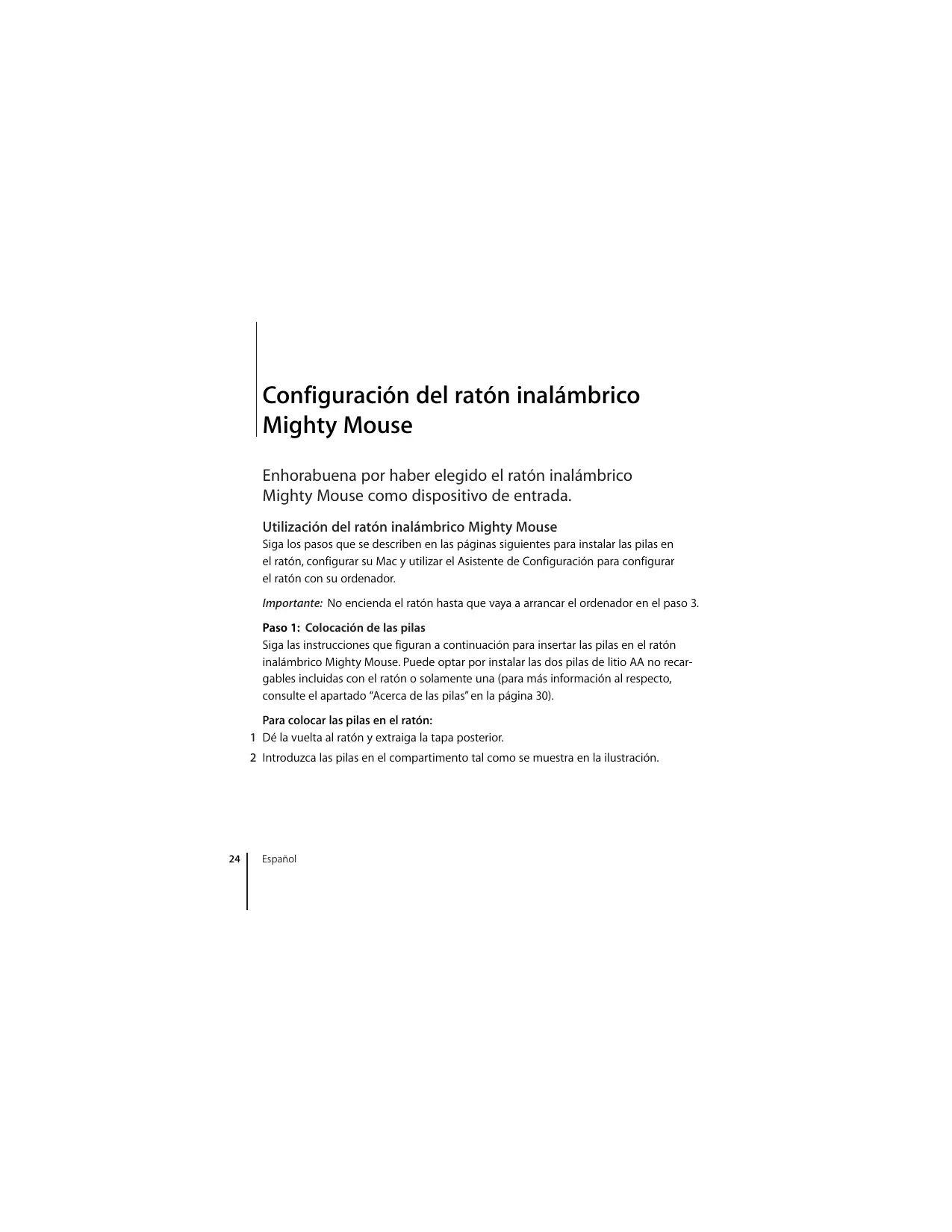 Configuración del ratón inalámbrico Mighty Mouse Enhorabuena por haber elegido el ratón inalámbrico Mighty Mouse como dispositivo de entrada. Utilización del ratón inalámbrico Mighty Mouse Siga los pasos que se describen en las páginas siguientes para instalar las pilas en el ratón, configurar su Mac y utilizar el Asistente de Configuración para configurar el ratón con su ordenador. Importante: No encienda el ratón hasta que vaya a arrancar el ordenador en el paso 3. Paso 1: Colocación de las pilas Siga las instrucciones que figuran a continuación para insertar las pilas en el ratón inalámbrico Mighty Mouse. Puede optar por instalar las dos pilas de litio AA no recargables incluidas con el ratón o solamente una (para más información al respecto, consulte el apartado “Acerca de las pilas” en la página 30). Para colocar las pilas en el ratón: 1 Dé la vuelta al ratón y extraiga la tapa posterior. 2 Introduzca las pilas en el compartimento tal como se muestra en la ilustración.