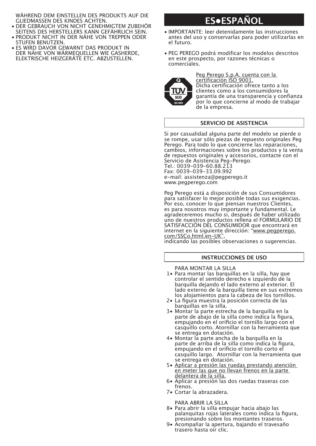 ES•ESPAÑOL • IMPORTANTE: leer detenidamente las instrucciones antes del uso y conservarlas para poder utilizarlas en el futuro. • PEG PEREGO podrá modificar los modelos descritos en este prospecto, por razones técnicas o comerciales. Peg Perego S.p.A. cuenta con la certificación ISO 9001. Dicha certificación ofrece tanto a los clientes como a los consumidores la garantía de una transparencia y confianza por lo que concierne al modo de trabajar de la empresa. SERVICIO DE ASISTENCIA Si por casualidad alguna parte del modelo se pierde o se rompe, usar sólo piezas de repuesto originales Peg Perego. Para todo lo que concierne las reparaciones, cambios, informaciones sobre los productos y la venta de repuestos originales y accesorios, contacte con el Servicio de Asistencia Peg-Perego: Tel.: 0039-039-60.88.213 Fax: 0039-039-33.09.992 e-mail: assistenza@pegperego.it www.pegperego.com Peg Perego está a disposición de sus Consumidores para satisfacer lo mejor posible todas sus exigencias. Por eso, conocer lo que piensan nuestros Clientes, es para nosotros muy importante y fundamental. Le agradeceremos mucho si, después de haber utilizado uno de nuestros productos rellena el FORMULARIO DE SATISFACCIÓN DEL CONSUMIDOR que encontrará en internet en la siguiente dirección: “www.pegperego. com/SSCo.html.en-UK”, indicando las posibles observaciones o sugerencias. INSTRUCCIONES DE USO PARA MONTAR LA SILLA 1• Para montar las barquillas en la silla, hay que controlar el sentido derecho e izquierdo de la barquilla dejando el lado externo al exterior. El lado externo de la barquilla tiene en sus extremos los alojamientos para la cabeza de los tornillos. 2• La figura muestra la posición correcta de las barquillas en la silla. 3• Montar la parte estrecha de la barquilla en la parte de abajo de la silla como indica la figura, empujando en el orificio el tornillo largo con el casquillo corto. Atornillar con la herramienta que se entrega en dotación. 4• Montar la parte ancha de la barquilla en la parte de arriba de la silla como indica la figura, empujando en el orificio el tornillo corto el casquillo largo. Atornillar con la herramienta que se entrega en dotación. 5• Aplicar a presión las ruedas prestando atención en meter las que no llevan frenos en la parte delantera de la silla. 6• Aplicar a presión las dos ruedas traseras con frenos. 7• Cortar la abrazadera. PARA ABRIR LA SILLA 8• Para abrir la silla empujar hacia abajo las palanquitas rojas laterales como indica la figura, presionando sobre los montantes traseros. 9• Acompañar la apertura, bajando el travesaño trasero hasta oír clic.