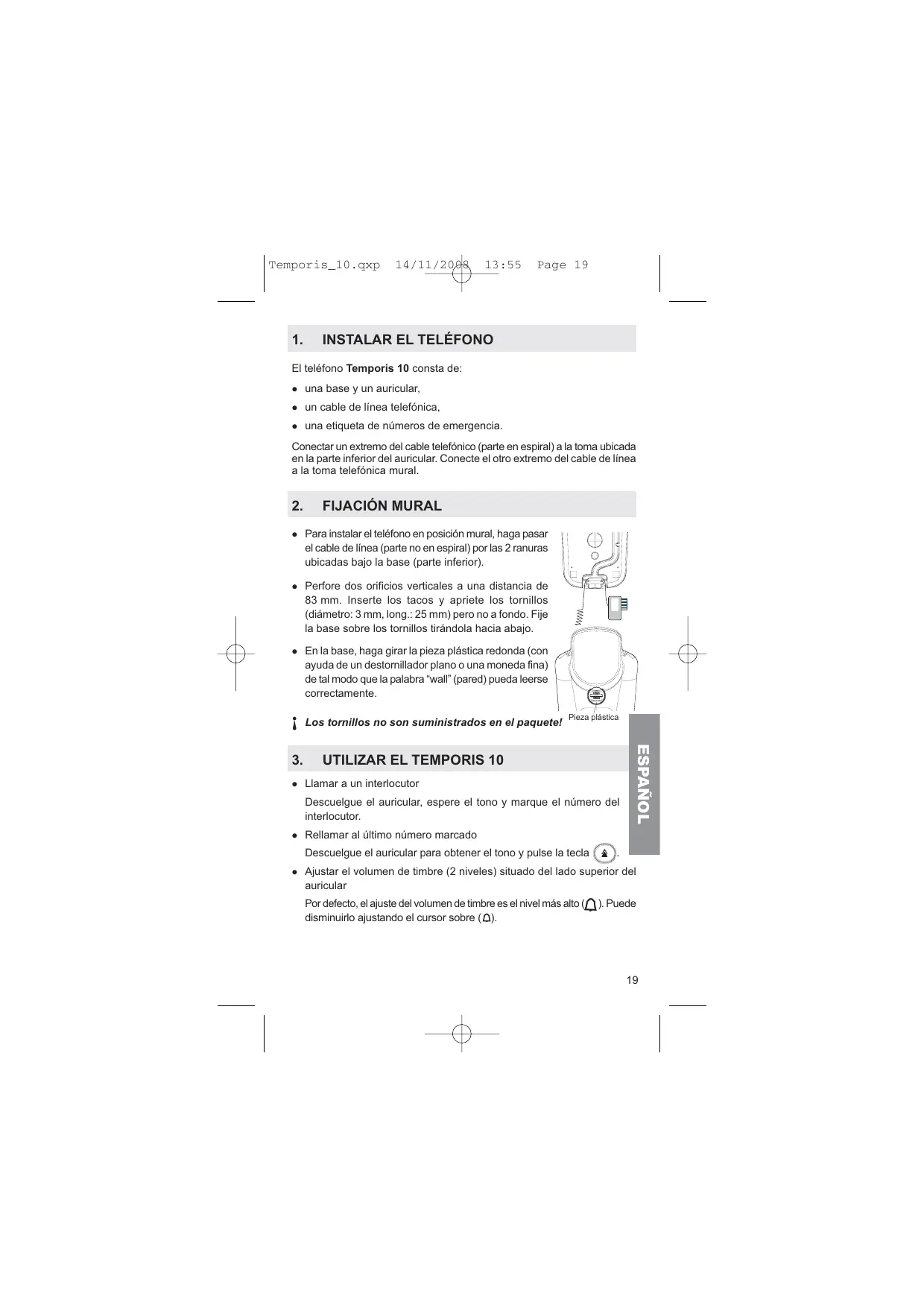 FIJACIÓN MURAL Para instalar el teléfono en posición mural, haga pasar el cable de línea (parte no en espiral) por las 2 ranuras ubicadas bajo la base (parte inferior).