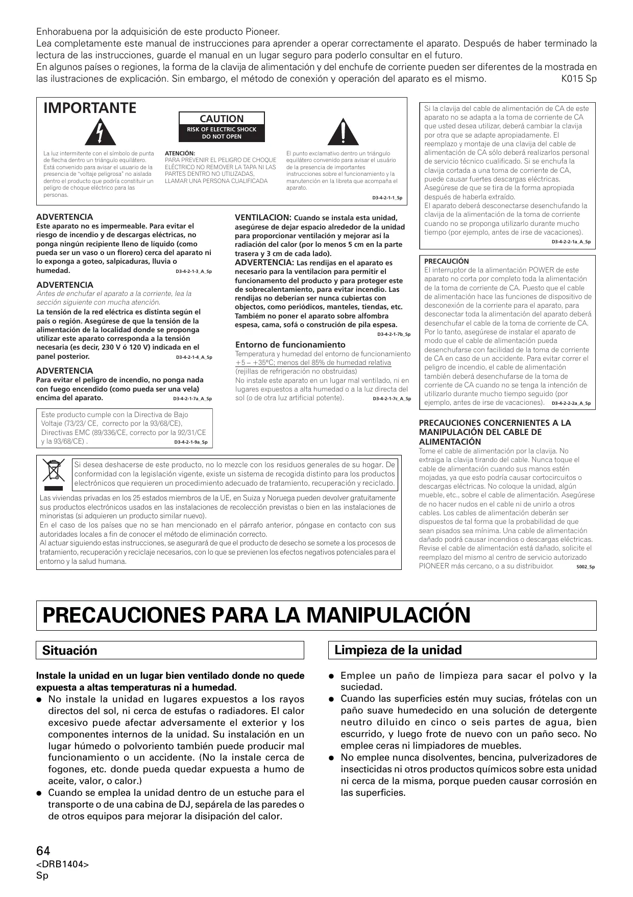 Tome el cable de alimentacion por la clavija. No extraiga la clavija tirando del cable. Nunca toque el cable de alimentacion cuando sus manos esten mojadas, ya que thisouldacause cortocircuitos o descargas electricas.No coloque la unidad,algun mueble,etc.,sobre el cable de alimentacion.Asegurese de no hacer{nudos en el cable ni de unirlo aothers cables.Los cables de alimentaciondeferan ser dispuestos de tal forma que la probabilitad de que Sean pisados sea minima.Auna cable de alimentacion daado podracause incendios orcargas electrolyticas.Revise el cable de alimentacion esta daado,solicite el reemplazo delismo al centro de service autorizzato PIONEER mas cercano,o a su distribuidor.