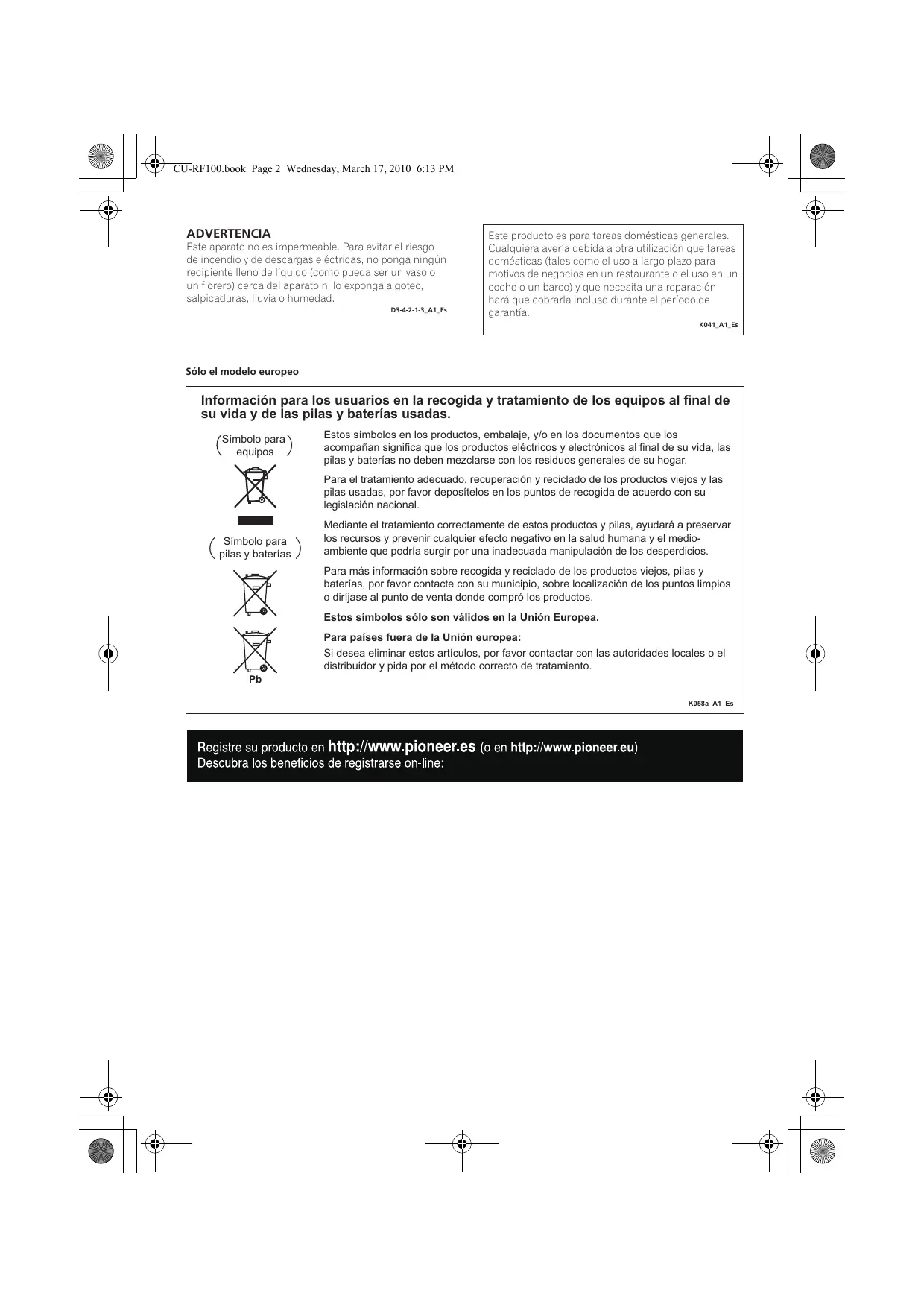 Por medio de la presente Pioneer declara que el CU-RF100-U cumple con los requisitos esencias y cualesquiera otheras disponeciones aplicables o exigibles de la Directiva 1999/5/CE