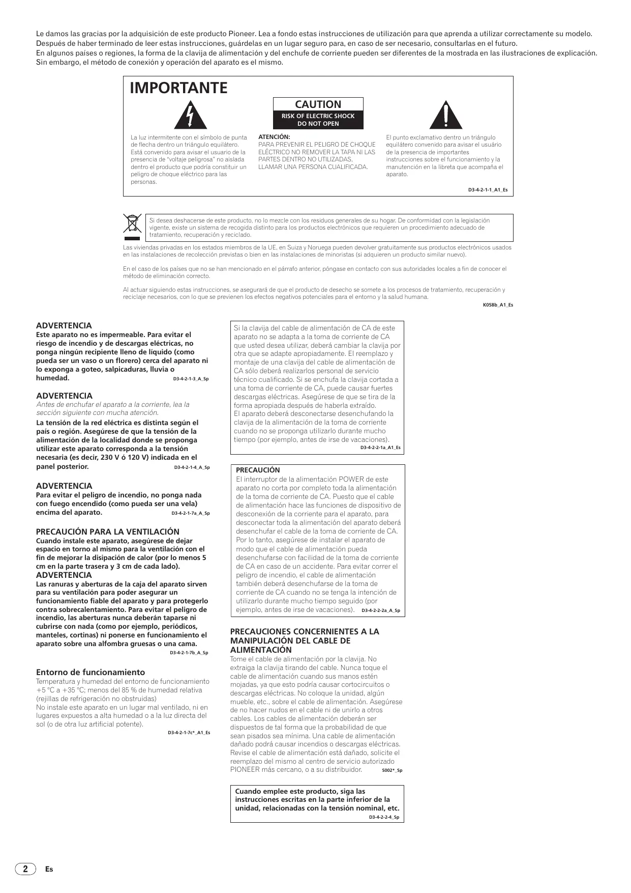 ALIMENTACIÓN Tome el cable de alimentación por la clavija. No extraiga la clavija tirando del cable. Nunca toque el cable de alimentación cuando sus manos estén mojadas, ya que esto podría causar cortocircuitos o descargas eléctricas. No coloque la unidad, algún mueble, etc., sobre el cable de alimentación. Asegúrese de no hacer nudos en el cable ni de unirlo a otros cables. Los cables de alimentación deberán ser dispuestos de tal forma que la probabilidad de que sean pisados sea mínima. Una cable de alimentación dañado podrá causar incendios o descargas eléctricas. Revise el cable de alimentación está dañado, solicite el reemplazo del mismo al centro de servicio autorizado S002*_Sp PIONEER más cercano, o a su distribuidor. Cuando emplee este producto, siga las instrucciones escritas en la parte inferior de la unidad, relacionadas con la tensión nominal, etc. D3-4-2-2-4_Sp
