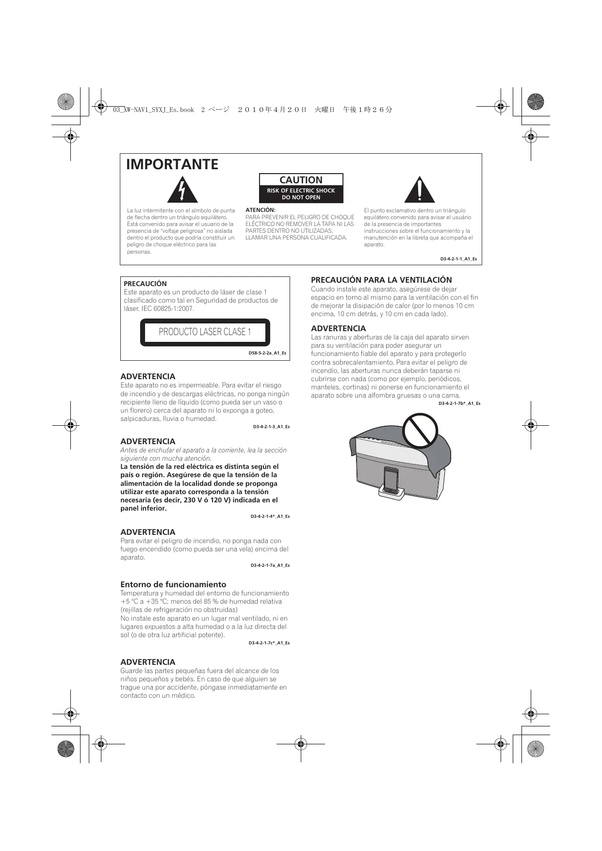 A er Tous droits de reproduction et de traduction réservés. Fr 4 PRECAUCIONES CONCERNIENTES A LA intenciôn de utilizarlo durante much tiempo seguido (por ejemplo, antes de irse de MANIPULACIÔN DEL CABLE DE vacaciones) ALIMENTACION D342-2-28* A1 Es Tome el cable de alimentacién por la clavija. No extraiga la clavija tirando del cable. Nunca toque el cable de alimentacién cuando sus manos estén Este producto es para tareas domésticas mojadas, ya que esto podria causar cortocircuitos o generales. Cualquiera averia debida a otra descargas eléctricas. No coloque la unidad, algün utilizaciôn que tareas domésticas (tales como el mueble, etc., sobre el cable de alimentacién. uso a largo plazo para motivos de negocios en Asegürese de no hacer nudos en el cable ni de unirlo à un restaurante o el uso en un coche o un barco) otros cables. Los cables de alimentacién deberän ser y que necesita una reparacién harä que cobrarla dispuestos de tal forma que la probabilidad de que incluso durant el periodo de garantie. sean pisados sea minima. Una cable de alimentaciôn Koët As dañado podrä causar incendios o descargas eléctricas. Revise el cable de alimentaciôn est dañado, solicite el reemplazo del mismo al centro de servicio autorizado Cuando utilice este producte, confirme la PIONEER mâs cercano, o a su distribuidor informaciôn de seguridad mostrada en la parte sat inferior de la unidad. Daaaaa ere
