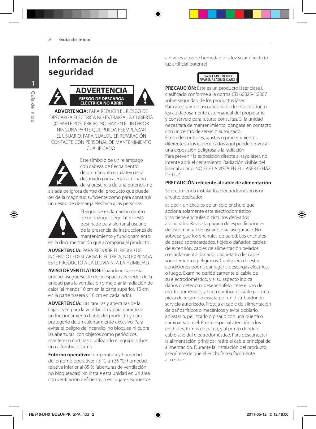 PRECAUCIÓN: Éste es un producto láser clase I, clasificado conforme a la norma CEI 60825-1:2007 sobre seguridad de los productos láser. Para asegurar un uso apropiado de este producto, lea cuidadosamente este manual del propietario y consérvelo para futuras consultas. Si la unidad necesitara de mantenimiento, póngase en contacto con un centro de servicio autorizado. El uso de controles, ajustes o procedimientos diferentes a los especificados aquí puede provocar una exposición peligrosa a la radiación. Para prevenir la exposición directa al rayo láser, no intente abrir el cerramiento. Radiación visible del láser al abrirlo. NO FIJE LA VISTA EN EL LÁSER O HAZ DE LUZ. PRECAUCIÓN referente al cable de alimentación Se recomienda instalar los electrodomésticos un circuito dedicado; es decir, un circuito de un solo enchufe que acciona solamente este electrodoméstico y no tiene enchufes o circuitos derivados adicionales. Revise la página de especificaciones de este manual de usuario para asegurarse. No sobrecargue los enchufes de pared. Los enchufes de pared sobrecargados, flojos o dañados, cables de extensión, cables de alimentación pelados, o el aislamiento dañado o agrietado del cable son elementos peligrosos. Cualquiera de estas condiciones podría dar lugar a descargas eléctricas o fuego. Examine periódicamente el cable de su electrodoméstico, y si su aspecto indica daños o deterioro, desenchúfelo, cese el uso del electrodoméstico, y haga cambiar el cable por una pieza de recambio exacta por un distribuidor de servicio autorizado. Proteja el cable de alimentación de daños físicos o mecánicos y evite doblarlo, aplastarlo, pellizcarlo o pisarlo con una puerta o caminar sobre él. Preste especial atención a los enchufes, tomas de pared, y al punto donde el cable sale del electrodoméstico. Para desconectar la alimentación principal, retire el cable principal de alimentación. Durante la instalación del producto, asegúrese de que el enchufe sea fácilmente accesible.