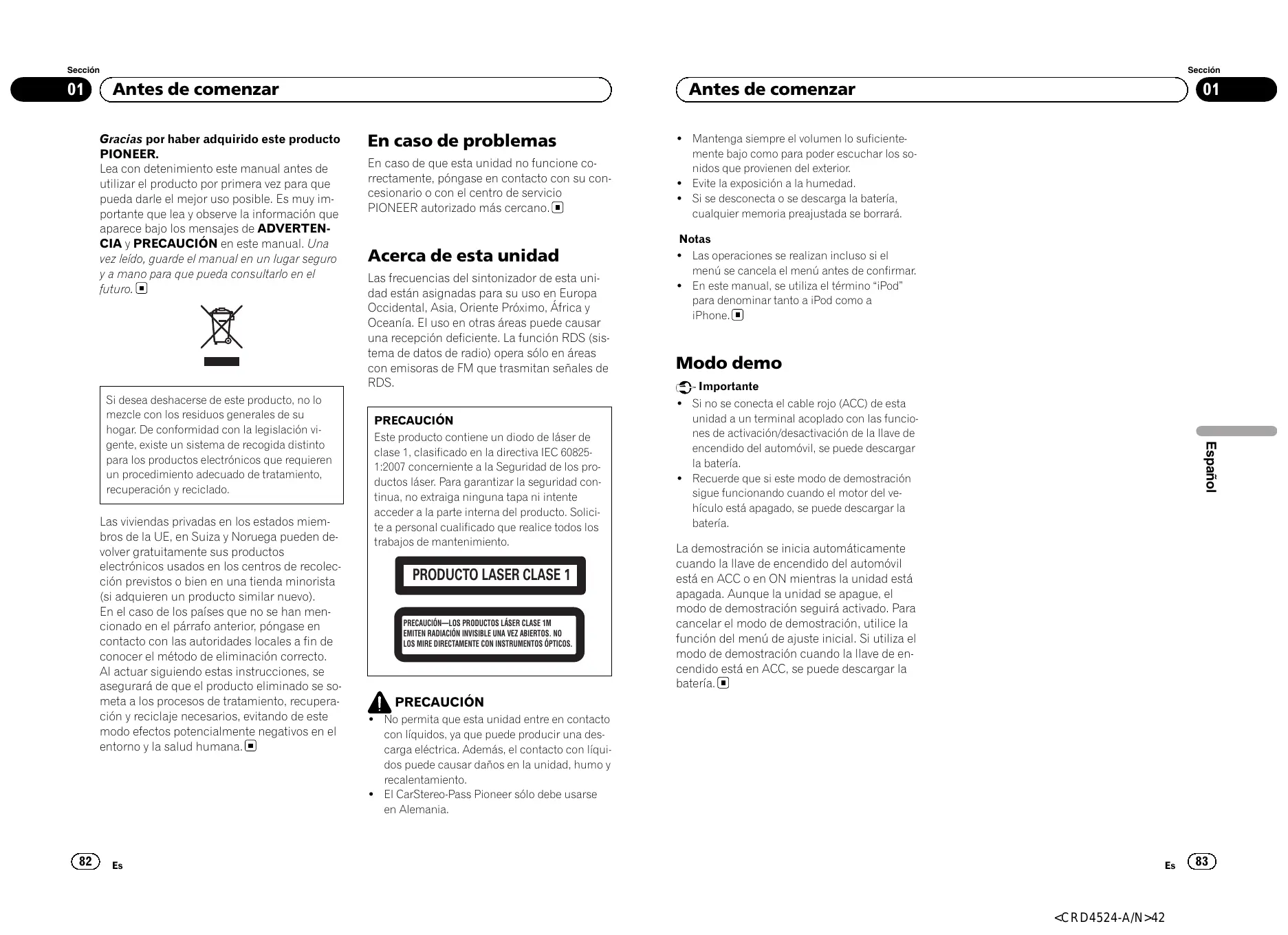 En caso de problemas En caso de que esta unidad no funcione correctamente, póngase en contacto con su concesionario o con el centro de servicio PIONEER autorizado más cercano. Acerca de esta unidad Las frecuencias del sintonizador de esta unidad están asignadas para su uso en Europa Occidental, Asia, Oriente Próximo, África y Oceanía. El uso en otras áreas puede causar una recepción deficiente. La función RDS (sistema de datos de radio) opera sólo en áreas con emisoras de FM que trasmitan señales de RDS. PRECAUCIÓN Este producto contiene un diodo de láser de clase 1, clasificado en la directiva IEC 608251:2007 concerniente a la Seguridad de los productos láser. Para garantizar la seguridad continua, no extraiga ninguna tapa ni intente acceder a la parte interna del producto. Solicite a personal cualificado que realice todos los trabajos de mantenimiento.