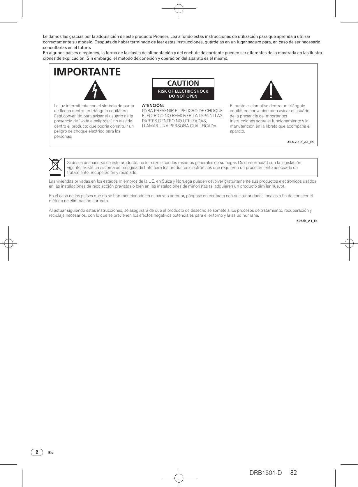 ELÉCTRICO NO REMOVER LA TAPA NI LAS PARTES DENTRO NO UTILIZADAS, LLAMAR UNA PERSONA CUALIFICADA. El punto exclamativo dentro un triángulo equilátero convenido para avisar el usuário de la presencia de importantes instrucciones sobre el funcionamiento y la manutención en la libreta que acompaña el aparato. D3-4-2-1-1_A1_Es Si desea deshacerse de este producto, no lo mezcle con los residuos generales de su hogar. De conformidad con la legislación vigente, existe un sistema de recogida distinto para los productos electrónicos que requieren un procedimiento adecuado de tratamiento, recuperación y reciclado. Las viviendas privadas en los estados miembros de la UE, en Suiza y Noruega pueden devolver gratuitamente sus productos electrónicos usados en las instalaciones de recolección previstas o bien en las instalaciones de minoristas (si adquieren un producto similar nuevo). En el caso de los países que no se han mencionado en el párrafo anterior, póngase en contacto con sus autoridades locales a fin de conocer el método de eliminación correcto. Al actuar siguiendo estas instrucciones, se asegurará de que el producto de desecho se somete a los procesos de tratamiento, recuperación y reciclaje necesarios, con lo que se previenen los efectos negativos potenciales para el entorno y la salud humana. K058b_A1_Es