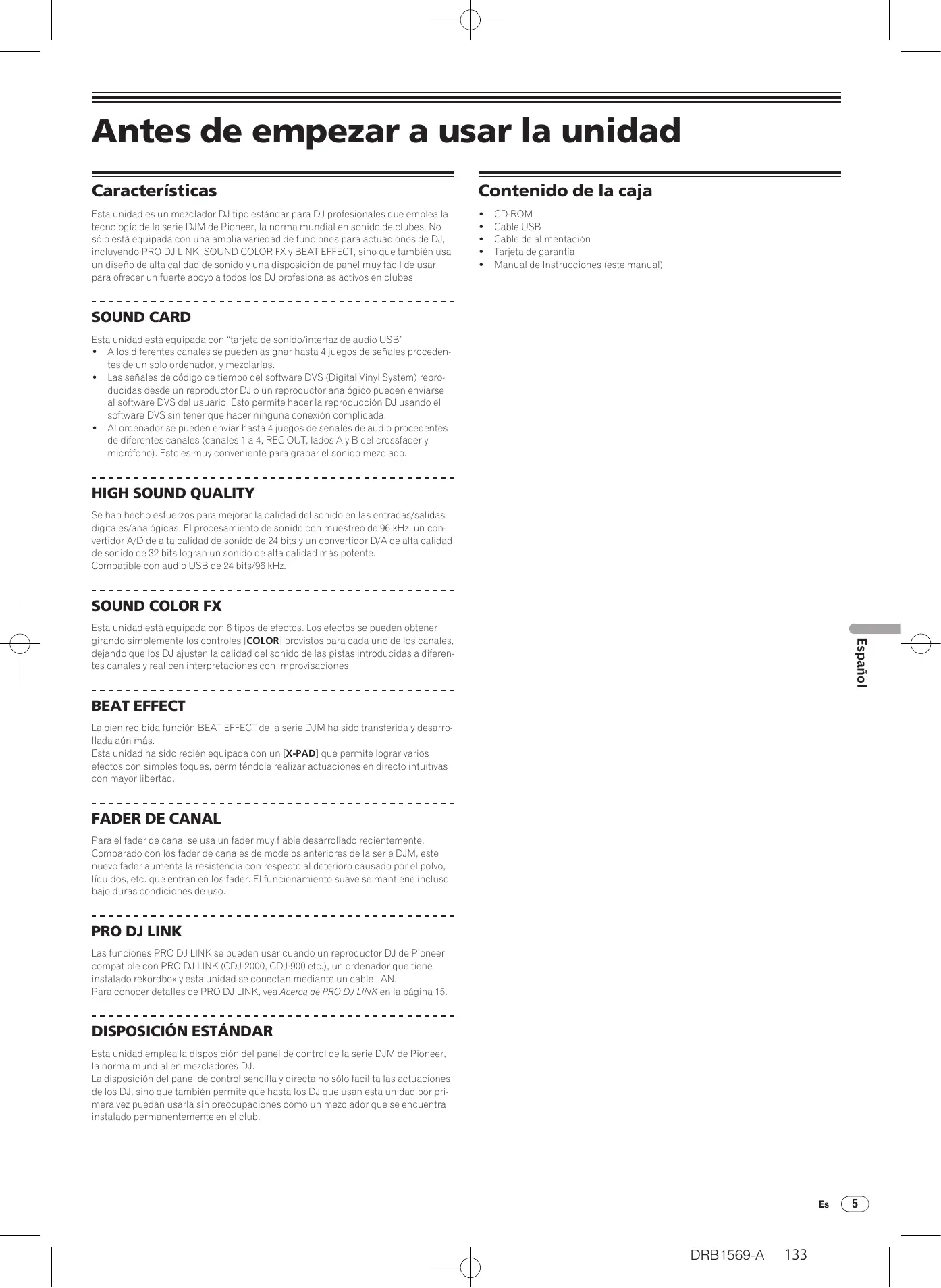 Contenido Cómo leer este manual Los nombres de las visualizaciones, menús y botones de este manual van entre corchetes. (p. ej.: Canal [MASTER], [ON/OFF], menú [File]) Lista de mensajes MIDI Cambio de los ajustes Acerca de la función de espera automática................................................................23 Acerca de la función talk-over......................................................................................23 Configuración de preferencias.....................................................................................23 Antes de empezar a usar la unidad Características Contenido de la caja Esta unidad es un mezclador DJ tipo estándar para DJ profesionales que emplea la tecnología de la serie DJM de Pioneer, la norma mundial en sonido de clubes. No sólo está equipada con una amplia variedad de funciones para actuaciones de DJ, incluyendo PRO DJ LINK, SOUND COLOR FX y BEAT EFFECT, sino que también usa un diseño de alta calidad de sonido y una disposición de panel muy fácil de usar para ofrecer un fuerte apoyo a todos los DJ profesionales activos en clubes.