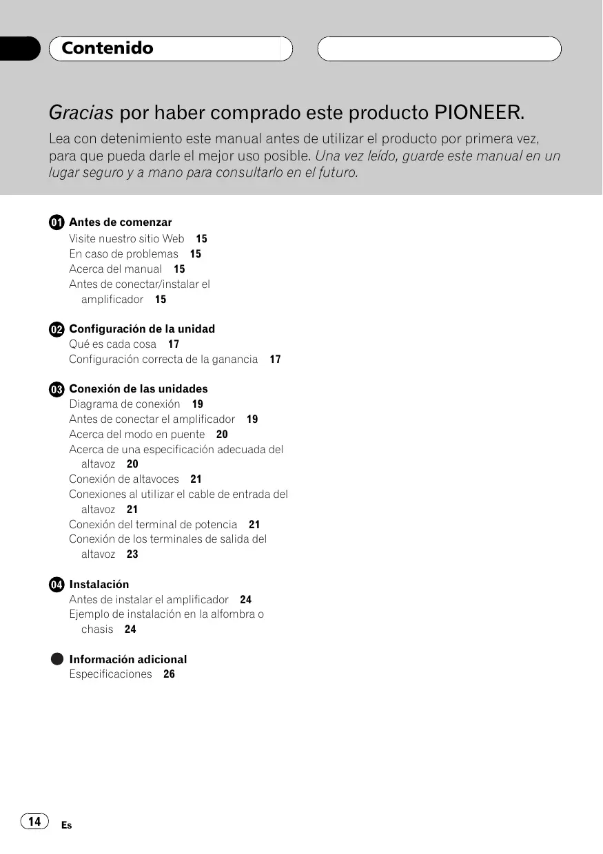 Gracias por haber comprado este producto PIONEER. Lea con detenimiento este manual antes de utilizar el producto por primera vez, para que pueda darle el mejor uso posible. Una vez leído, guarde este manual en un lugar seguro y a mano para consultarlo en el futuro. Antes de comenzar Visite nuestro sitio Web 15 En caso de problemas 15 Acerca del manual 15 Antes de conectar/instalar el amplificador 15 Configuración de la unidad Qué es cada cosa 17 Configuración correcta de la ganancia 17 Conexión de las unidades Diagrama de conexión 19 Antes de conectar el amplificador 19 Acerca del modo en puente 20 Acerca de una especificación adecuada del altavoz 20 Conexión de altavoces 21 Conexiones al utilizar el cable de entrada del altavoz 21 Conexión del terminal de potencia 21 Conexión de los terminales de salida del altavoz 23 Instalación Antes de instalar el amplificador 24 Ejemplo de instalación en la alfombra o chasis 24 Información adicional Especificaciones 26