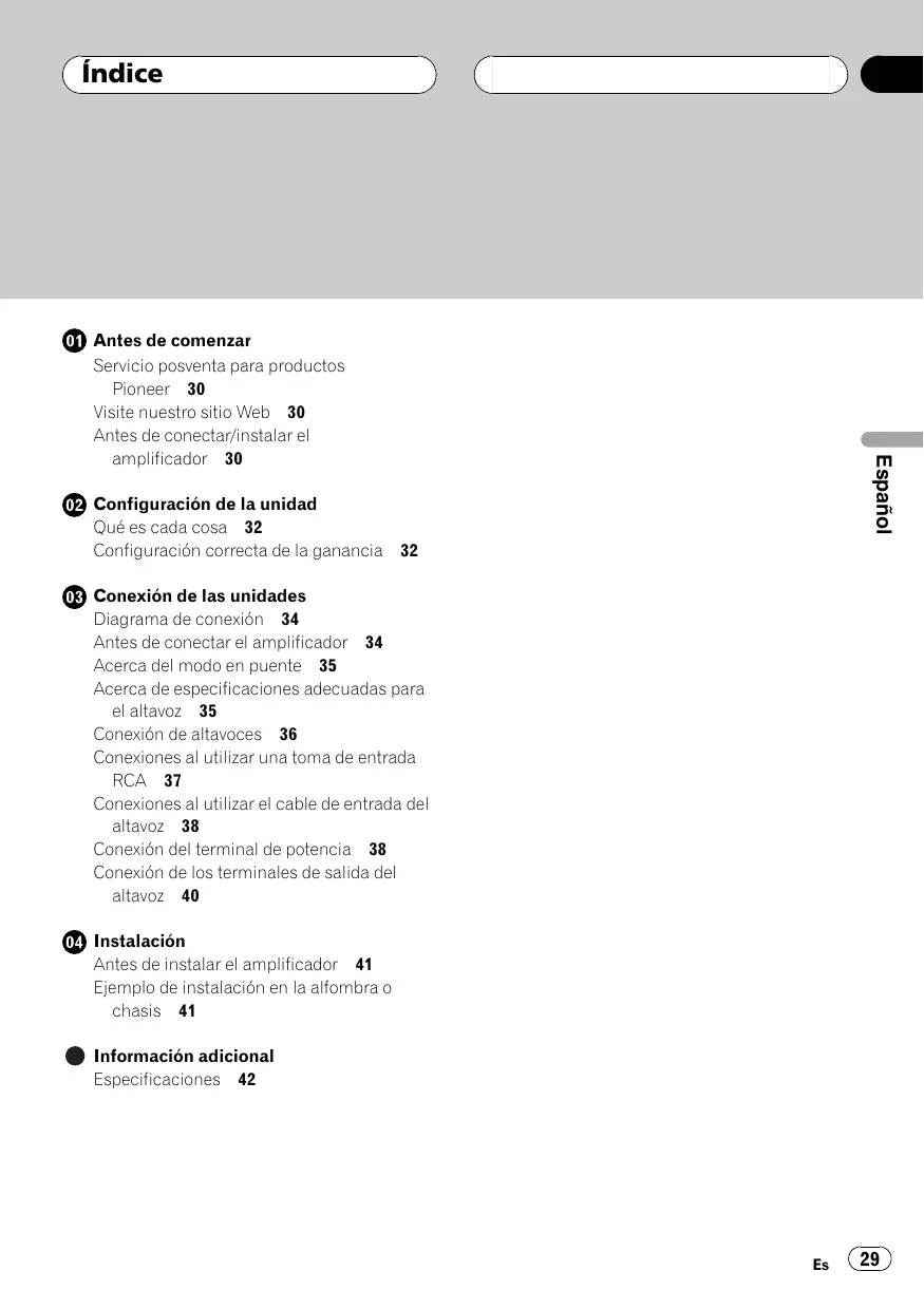 @ antes de comenzar Servicio posventa para productos Pioneer 30 Visite nuestro sitio Web 30 Antes de conectar/instalar el emplificador 30 @ Configuracién de la unidad Qué es cada cosa 32 Configuracién correcta de la ganancia 82 @ Conexién de las unidades Diagrama de conexién 34 Antes de conectar el amplificador 34 Acerca del modo en puente 35 Acerca de especificaciones adecuadas para elaltavoz 35 Conexién de altavoces 36 Conexiones al utilizar una toma de entrada RCA 87 Conexiones al utilizar el cable de entrada del altavoz 38 Conexién del terminal de potencia 38 Conexién de los terminales de salida del altavoz 40 @ instalaciôn Antes de instalar el amplificador 41 Ejemplo de instalacién en la alfombra o chasis 41 @ informaciôn adicional Especificaciones 42 louedsz l