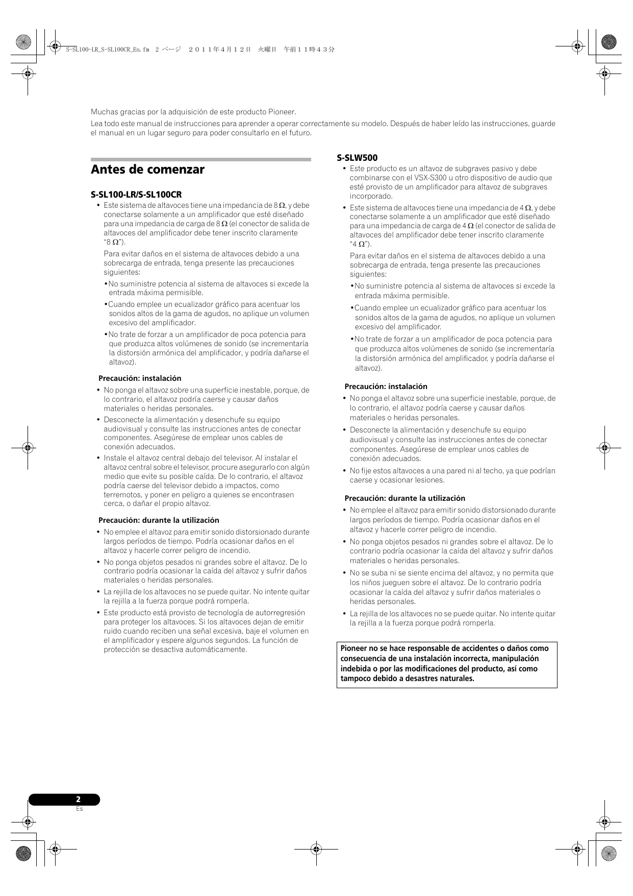 Pioneer no se hace responsable de accidentes o daños como consecuencia de una instalación incorrecta, manipulación indebida o por las modificaciones del producto, así como tampoco debido a desastres naturales.