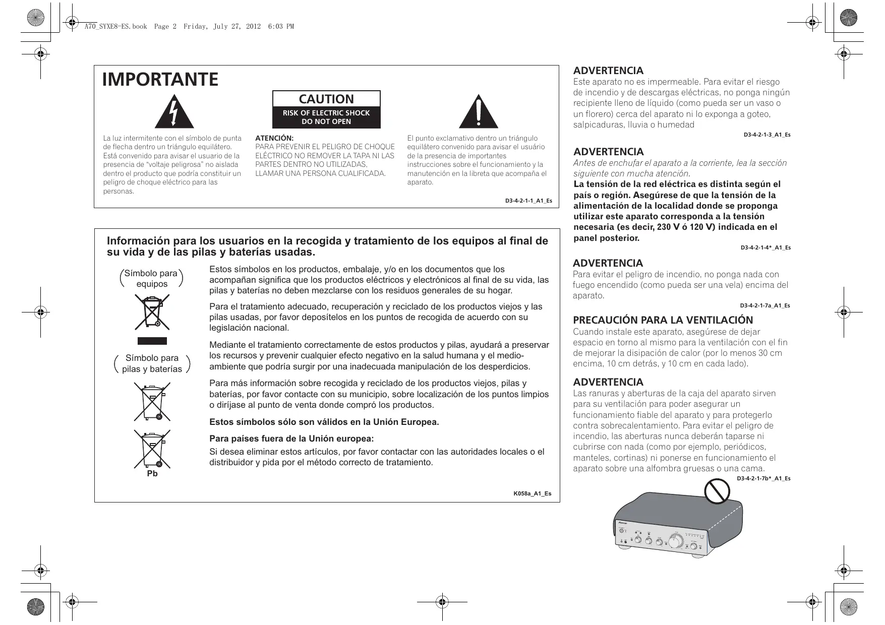 ADVERTENCIA Las ranuras y aberturas de la caja del aparato sirven para su ventilación para poder asegurar un funcionamiento fiable del aparato y para protegerlo contra sobrecalentamiento. Para evitar el peligro de incendio, las aberturas nunca deberán taparse ni cubrirse con nada (como por ejemplo, periódicos, manteles, cortinas) ni ponerse en funcionamiento el aparato sobre una alfombra gruesas o una cama. D3-4-2-1-7b*_A1_Es