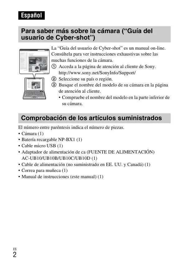 Comprobación de los artículos suministrados El número entre paréntesis indica el número de piezas. • Cámara (1) • Batería recargable NP-BX1 (1) • Cable micro USB (1) • Adaptador de alimentación de ca (FUENTE DE ALIMENTACIÓN) AC-UB10/UB10B/UB10C/UB10D (1) • Cable de alimentación (no suministrado en EE. UU. y Canadá) (1) • Correa para muñeca (1) • Manual de instrucciones (este manual) (1)