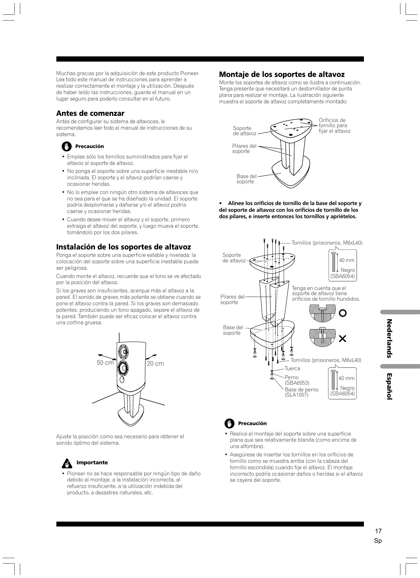 Instalaciôn de los soportes de altavoz Ponga el soporte sobre una superficie estable y nivelada: la colocaciôn del soporte sobre una superficie inestable puede ser peligrosa.