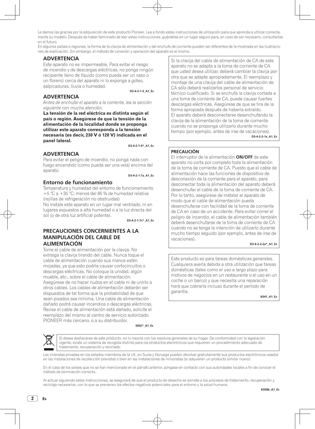ALIMENTACIÓN Tome el cable de alimentación por la clavija. No extraiga la clavija tirando del cable. Nunca toque el cable de alimentación cuando sus manos estén mojadas, ya que esto podría causar cortocircuitos o descargas eléctricas. No coloque la unidad, algún mueble, etc., sobre el cable de alimentación. Asegúrese de no hacer nudos en el cable ni de unirlo a otros cables. Los cables de alimentación deberán ser dispuestos de tal forma que la probabilidad de que sean pisados sea mínima. Una cable de alimentación dañado podrá causar incendios o descargas eléctricas. Revise el cable de alimentación está dañado, solicite el reemplazo del mismo al centro de servicio autorizado PIONEER más cercano, o a su distribuidor. PRECAUCIÓN El interruptor de la alimentación ON/OFF de este aparato no corta por completo toda la alimentación de la toma de corriente de CA. Puesto que el cable de alimentación hace las funciones de dispositivo de desconexión de la corriente para el aparato, para desconectar toda la alimentación del aparato deberá desenchufar el cable de la toma de corriente de CA. Por lo tanto, asegúrese de instalar el aparato de modo que el cable de alimentación pueda desenchufarse con facilidad de la toma de corriente de CA en caso de un accidente. Para evitar correr el peligro de incendio, el cable de alimentación también deberá desenchufarse de la toma de corriente de CA cuando no se tenga la intención de utilizarlo durante mucho tiempo seguido (por ejemplo, antes de irse de vacaciones). D3-4-2-2-2a*_A1_Es Este producto es para tareas domésticas generales. Cualquiera avería debida a otra utilización que tareas domésticas (tales como el uso a largo plazo para motivos de negocios en un restaurante o el uso en un coche o un barco) y que necesita una reparación hará que cobrarla incluso durante el período de garantía. K041_A1_Es S002*_A1_Es Si desea deshacerse de este producto, no lo mezcle con los residuos generales de su hogar. De conformidad con la legislación vigente, existe un sistema de recogida distinto para los productos electrónicos que requieren un procedimiento adecuado de tratamiento, recuperación y reciclado. Las viviendas privadas en los estados miembros de la UE, en Suiza y Noruega pueden devolver gratuitamente sus productos electrónicos usados en las instalaciones de recolección previstas o bien en las instalaciones de minoristas (si adquieren un producto similar nuevo). En el caso de los países que no se han mencionado en el párrafo anterior, póngase en contacto con sus autoridades locales a fin de conocer el método de eliminación correcto. Al actuar siguiendo estas instrucciones, se asegurará de que el producto de desecho se somete a los procesos de tratamiento, recuperación y reciclaje necesarios, con lo que se previenen los efectos negativos potenciales para el entorno y la salud humana. K058b_A1_Es