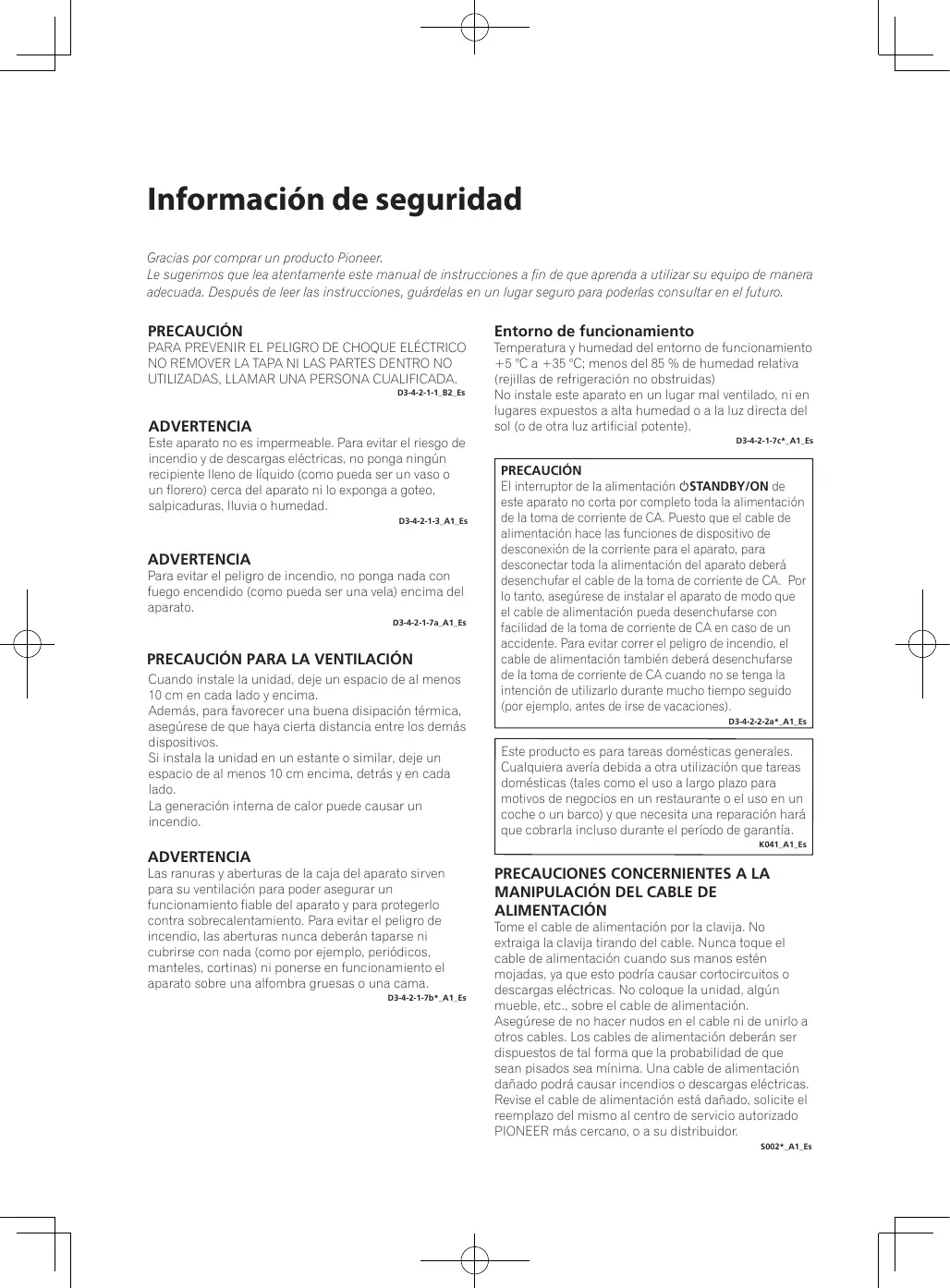 Información de seguridad Gracias por comprar un producto Pioneer. Le sugerimos que lea atentamente este manual de instrucciones a fin de que aprenda a utilizar su equipo de manera adecuada. Después de leer las instrucciones, guárdelas en un lugar seguro para poderlas consultar en el futuro.