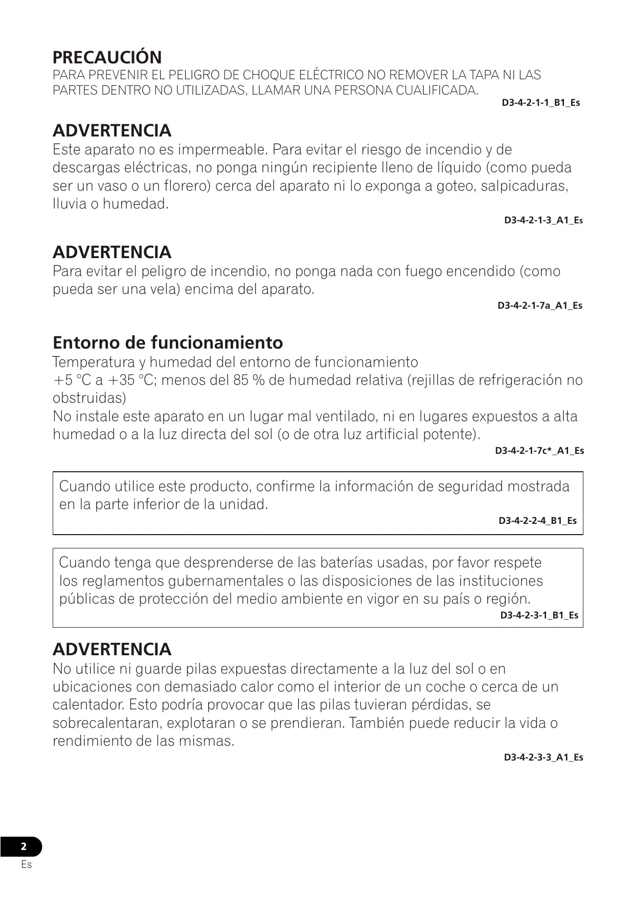 PRECAUCIÓN PARA PREVENIR EL PELIGRO DE CHOQUE ELÉCTRICO NO REMOVER LA TAPA NI LAS PARTES DENTRO NO UTILIZADAS, LLAMAR UNA PERSONA CUALIFICADA. D3-4-2-1-1_B1_Es ADVERTENCIA Este aparato no es impermeable. Para evitar el riesgo de incendio y de descargas eléctricas, no ponga ningún recipiente lleno de líquido (como pueda ser un vaso o un florero) cerca del aparato ni lo exponga a goteo, salpicaduras, lluvia o humedad. D3-4-2-1-3_A1_Es ADVERTENCIA Para evitar el peligro de incendio, no ponga nada con fuego encendido (como pueda ser una vela) encima del aparato. D3-4-2-1-7a_A1_Es Entorno de funcionamiento Temperatura y humedad del entorno de funcionamiento +5 °C a +35 °C; menos del 85 % de humedad relativa (rejillas de refrigeración no obstruidas) No instale este aparato en un lugar mal ventilado, ni en lugares expuestos a alta humedad o a la luz directa del sol (o de otra luz artificial potente). D3-4-2-1-7c*_A1_Es Cuando utilice este producto, confirme la información de seguridad mostrada en la parte inferior de la unidad. D3-4-2-2-4_B1_Es Cuando tenga que desprenderse de las baterías usadas, por favor respete los reglamentos gubernamentales o las disposiciones de las instituciones públicas de protección del medio ambiente en vigor en su país o región. D3-4-2-3-1_B1_Es ADVERTENCIA No utilice ni guarde pilas expuestas directamente a la luz del sol o en ubicaciones con demasiado calor como el interior de un coche o cerca de un calentador. Esto podría provocar que las pilas tuvieran pérdidas, se sobrecalentaran, explotaran o se prendieran. También puede reducir la vida o rendimiento de las mismas. D3-4-2-3-3_A1_Es
