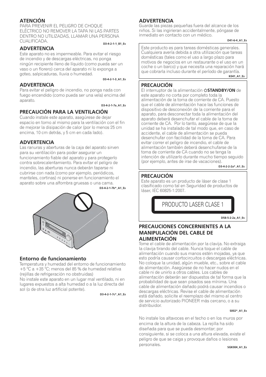 Cuando instale este aparato, asegúrese de dejar espacio en torno al mismo para la ventilación con el fin de mejorar la disipación de calor (por lo menos 25 cm encima, 10 cm detrás, y 5 cm en cada lado). ADVERTENCIA Las ranuras y aberturas de la caja del aparato sirven para su ventilación para poder asegurar un funcionamiento fiable del aparato y para protegerlo contra sobrecalentamiento. Para evitar el peligro de incendio, las aberturas nunca deberán taparse ni cubrirse con nada (como por ejemplo, periódicos, manteles, cortinas) ni ponerse en funcionamiento el aparato sobre una alfombra gruesas o una cama. D3-4-2-1-7b*_A1_Es El interruptor de la alimentación STANDBY/ON de este aparato no corta por completo toda la alimentación de la toma de corriente de CA. Puesto que el cable de alimentación hace las funciones de dispositivo de desconexión de la corriente para el aparato, para desconectar toda la alimentación del aparato deberá desenchufar el cable de la toma de corriente de CA. Por lo tanto, asegúrese de que la unidad se ha instalado de tal modo que, en caso de accidente, el cable de alimentación se pueda desenchufar con facilidad de la toma de CA. Para evitar correr el peligro de incendio, el cable de alimentación también deberá desenchufarse de la toma de corriente de CA cuando no se tenga la intención de utilizarlo durante mucho tiempo seguido (por ejemplo, antes de irse de vacaciones). D3-4-2-2-2a*_A1_Es PRECAUCIÓN Este aparato es un producto de láser de clase 1 clasificado como tal en Seguridad de productos de láser, IEC 60825-1:2007.