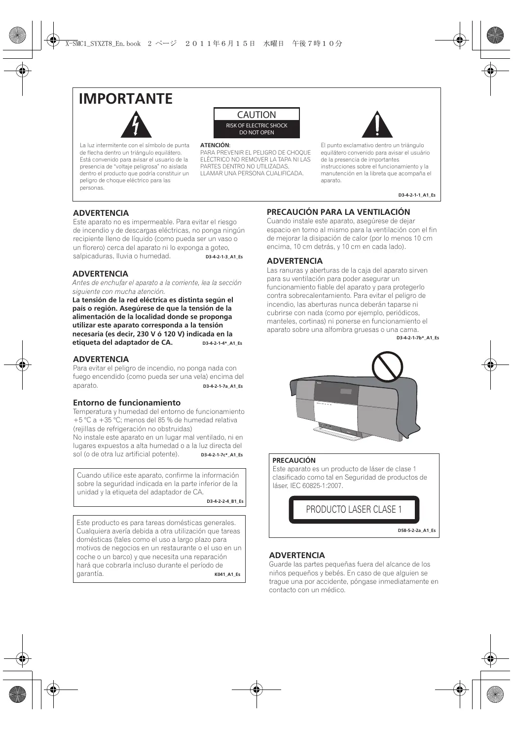 Este producto es para tareas domésticas generales. Cualquiera avería debida a otra utilización que tareas domésticas (tales como el uso a largo plazo para motivos de negocios en un restaurante o el uso en un coche o un barco) y que necesita una reparación hará que cobrarla incluso durante el período de K041_A1_Es garantía. D58-5-2-2a_A1_Es ADVERTENCIA Guarde las partes pequeñas fuera del alcance de los niños pequeños y bebés. En caso de que alguien se trague una por accidente, póngase inmediatamente en contacto con un médico. X-SMC1_SYXZT8_En.book 3 ページ