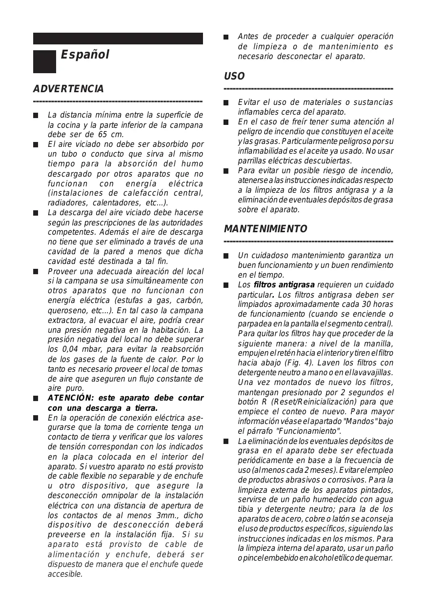 Los filtros antigrasa requirecenumbado particular. Los filtros antigrasa deben ser limpiados aproximamente cada 30 horas de funciona bajo (o que se enciende o parpadea en la pantalla el segmento central). Para quitar los filtros hay que proceber de la?siguemente forma: a nivel de la manilla, empujen el retén hacia interiory tiren el filtrho汇集 bajo (Fig.4). Laven los filtros con detergente neutro a mano o en ellavavajillas. Una vez montados de nuevo los filtros, mantengan presionado por 2 segundos el boton R (Reset/Reinitializacion) para que empiece el conteo de nuevo. Para mayor informacion vexe elapartado"Mandos" bajo el parrabo "Funcionamento".