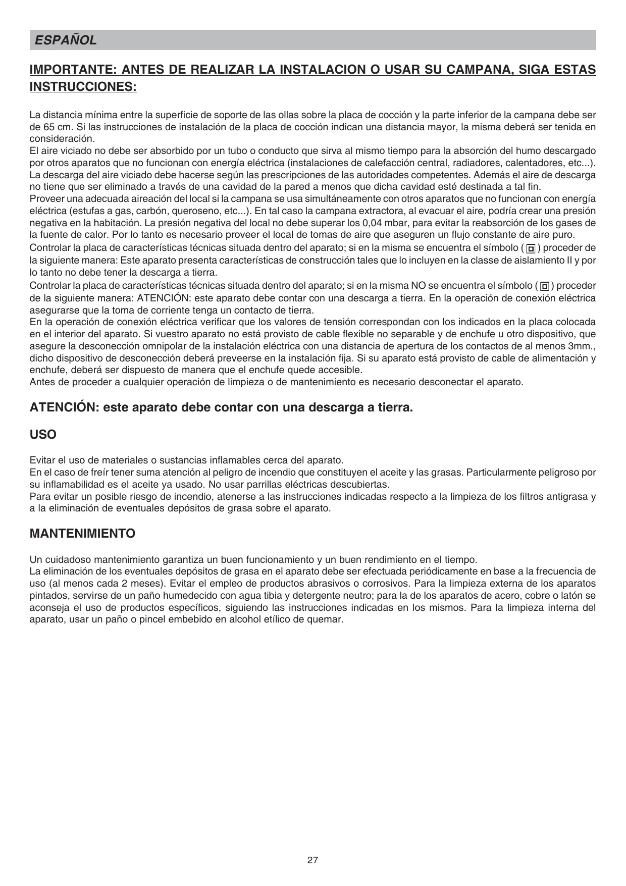 Proveer una adecuada aireacion del local si la campana se usa simultaneamente con other aparatos que no funciona con energia elctrica (estufas a gas, carbón, queroseno, etc...). En tal caso la campana extractor, al evacuar el aire, podría create un presión negativa en la habitación. La presión negativa del local no debe superar los 0,04 mbar, para evitar la reabsorción de los gases de la fuente de calor. Por lo tanto es必需ario proveer el local de tomas de aire que aseguren un flujo constante de aire puro.