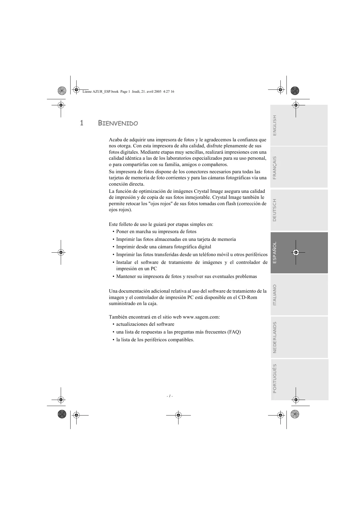 Este folleto de uso le guiarä por etapas simples en: + Poner en marcha su impresora de fotos + Imprimir las fotos almacenadas en una tarjeta de memoria + Imprimir desde una câmara fotogräfica digital + Imprimir las fotos transferidas desde un teléfono mévil u otros periféricos