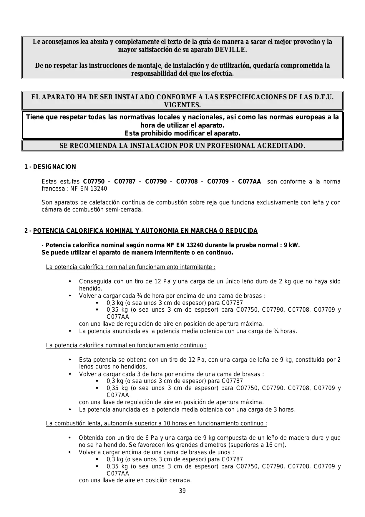 Estas estufas C07750 – C07787 – C07790 – C07708 – C07709 – C077AA son conforme a la norma francesa : NF EN 13240. Son aparatos de calefacción contínua de combustión sobre reja que funciona exclusivamente con leña y con cámara de combustión semi-cerrada.
