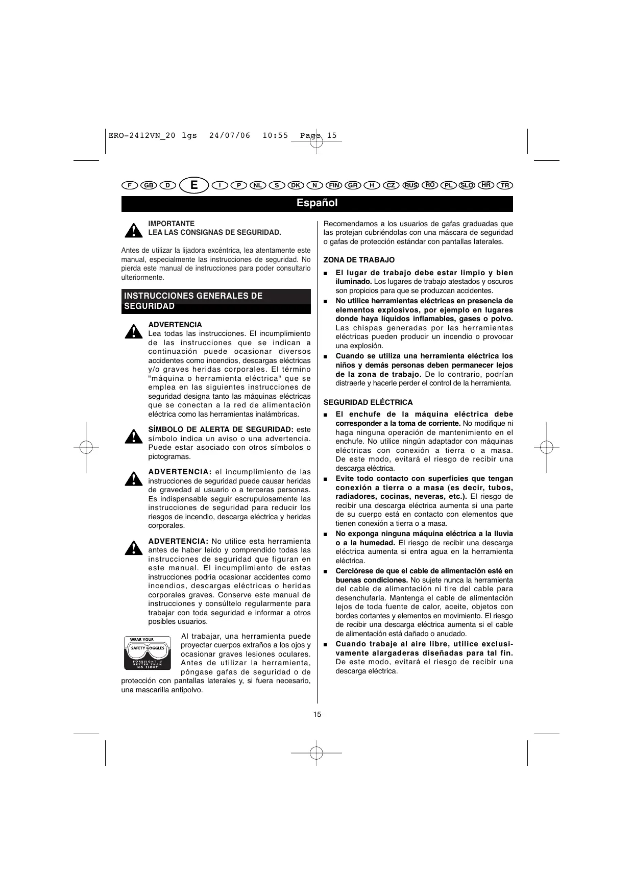 El enchufe de la máquina eléctrica debe corresponder a la toma de corriente. No modifique ni haga ninguna operación de mantenimiento en el enchufe. No utilice ningún adaptador con máquinas eléctricas con conexión a tierra o a masa. De este modo, evitará el riesgo de recibir una descarga eléctrica. Evite todo contacto con superficies que tengan conexión a tierra o a masa (es decir, tubos, radiadores, cocinas, neveras, etc.). El riesgo de recibir una descarga eléctrica aumenta si una parte de su cuerpo está en contacto con elementos que tienen conexión a tierra o a masa. No exponga ninguna máquina eléctrica a la lluvia o a la humedad. El riesgo de recibir una descarga eléctrica aumenta si entra agua en la herramienta eléctrica. Cerciórese de que el cable de alimentación esté en buenas condiciones. No sujete nunca la herramienta del cable de alimentación ni tire del cable para desenchufarla. Mantenga el cable de alimentación lejos de toda fuente de calor, aceite, objetos con bordes cortantes y elementos en movimiento. El riesgo de recibir una descarga eléctrica aumenta si el cable de alimentación está dañado o anudado. Cuando trabaje al aire libre, utilice exclusivamente alargaderas diseñadas para tal fin. De este modo, evitará el riesgo de recibir una descarga eléctrica. ERO-2412VN_20 lgs