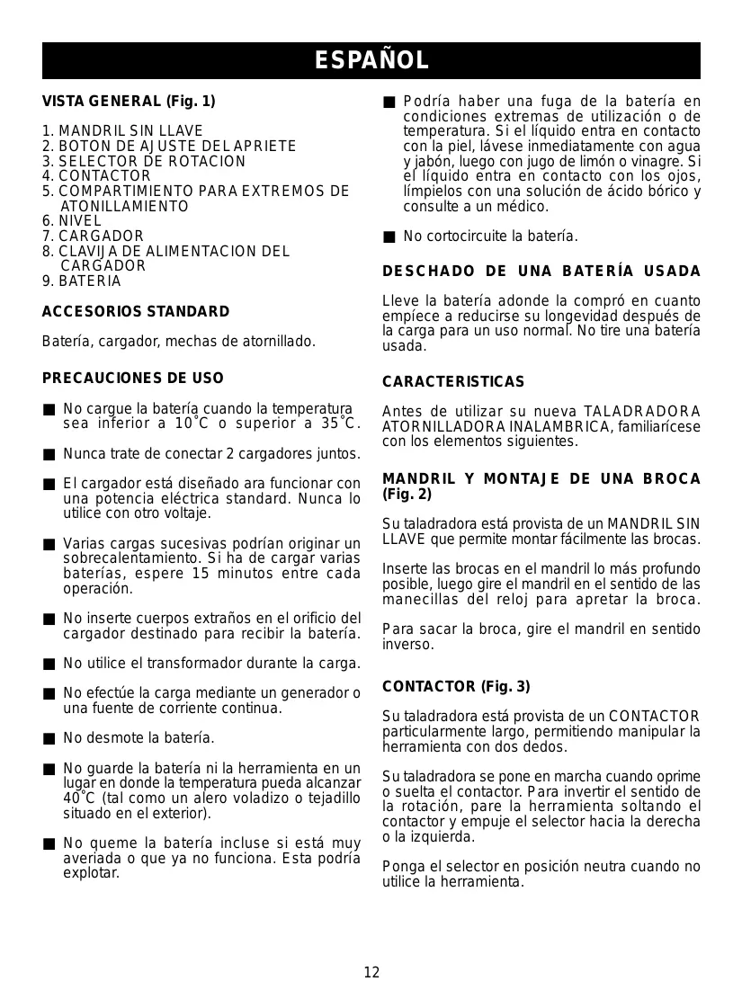 (Fig. 2) ■ El cargador está diseñado ara funcionar con una potencia eléctrica standard. Nunca lo utilice con otro voltaje. Su taladradora está provista de un MANDRIL SIN LLAVE que permite montar fácilmente las brocas. ■ Varias cargas sucesivas podrían originar un sobrecalentamiento. Si ha de cargar varias baterías, espere 15 minutos entre cada operación. Inserte las brocas en el mandril lo más profundo posible, luego gire el mandril en el sentido de las manecillas del reloj para apretar la broca. ■ No inserte cuerpos extraños en el orificio del cargador destinado para recibir la batería. Para sacar la broca, gire el mandril en sentido inverso. ■ No utilice el transformador durante la carga. CONTACTOR (Fig. 3) ■ No efectúe la carga mediante un generador o una fuente de corriente continua. Su taladradora está provista de un CONTACTOR particularmente largo, permitiendo manipular la herramienta con dos dedos. ■ No desmote la batería. ■ No guarde la batería ni la herramienta en un lugar en donde la temperatura pueda alcanzar 40˚C (tal como un alero voladizo o tejadillo situado en el exterior). Su taladradora se pone en marcha cuando oprime o suelta el contactor. Para invertir el sentido de la rotación, pare la herramienta soltando el contactor y empuje el selector hacia la derecha o la izquierda. ■ No queme la batería incluse si está muy averiada o que ya no funciona. Esta podría explotar. Ponga el selector en posición neutra cuando no utilice la herramienta.
