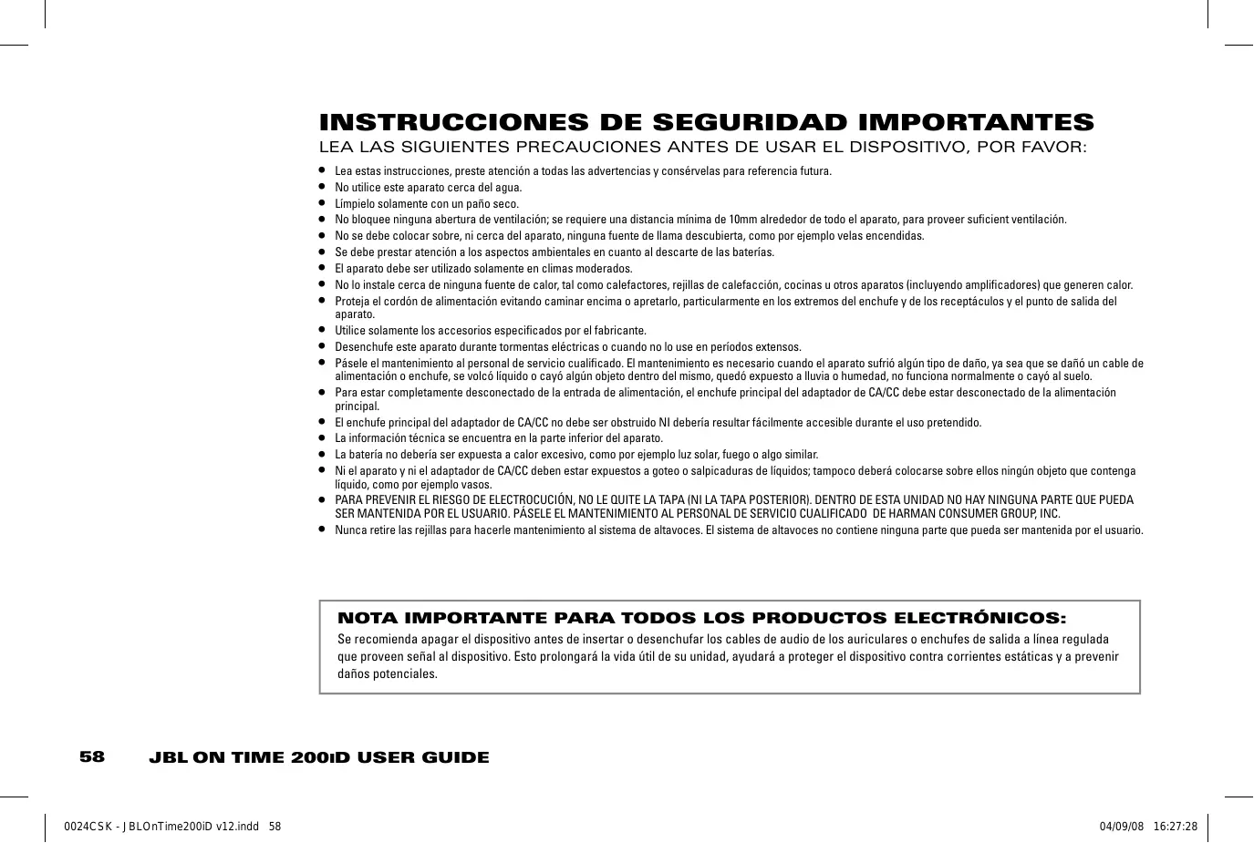 No utilice este aparato cerca del agua. Límpielo solamente con un paño seco. No bloquee ninguna abertura de ventilación; se requiere una distancia mínima de 10mm alrededor de todo el aparato, para proveer suficient ventilación. No se debe colocar sobre, ni cerca del aparato, ninguna fuente de llama descubierta, como por ejemplo velas encendidas. Se debe prestar atención a los aspectos ambientales en cuanto al descarte de las baterías. El aparato debe ser utilizado solamente en climas moderados. No lo instale cerca de ninguna fuente de calor, tal como calefactores, rejillas de calefacción, cocinas u otros aparatos (incluyendo amplificadores) que generen calor. Proteja el cordón de alimentación evitando caminar encima o apretarlo, particularmente en los extremos del enchufe y de los receptáculos y el punto de salida del aparato. Utilice solamente los accesorios especificados por el fabricante. Desenchufe este aparato durante tormentas eléctricas o cuando no lo use en períodos extensos. Pásele el mantenimiento al personal de servicio cualificado. El mantenimiento es necesario cuando el aparato sufrió algún tipo de daño, ya sea que se dañó un cable de alimentación o enchufe, se volcó líquido o cayó algún objeto dentro del mismo, quedó expuesto a lluvia o humedad, no funciona normalmente o cayó al suelo. Para estar completamente desconectado de la entrada de alimentación, el enchufe principal del adaptador de CA/CC debe estar desconectado de la alimentación principal. El enchufe principal del adaptador de CA/CC no debe ser obstruido NI debería resultar fácilmente accesible durante el uso pretendido. La información técnica se encuentra en la parte inferior del aparato. La batería no debería ser expuesta a calor excesivo, como por ejemplo luz solar, fuego o algo similar. Ni el aparato y ni el adaptador de CA/CC deben estar expuestos a goteo o salpicaduras de líquidos; tampoco deberá colocarse sobre ellos ningún objeto que contenga líquido, como por ejemplo vasos. PARA PREVENIR EL RIESGO DE ELECTROCUCIÓN, NO LE QUITE LA TAPA (NI LA TAPA POSTERIOR). DENTRO DE ESTA UNIDAD NO HAY NINGUNA PARTE QUE PUEDA SER MANTENIDA POR EL USUARIO. PÁSELE EL MANTENIMIENTO AL PERSONAL DE SERVICIO CUALIFICADO DE HARMAN CONSUMER GROUP, INC. Nunca retire las rejillas para hacerle mantenimiento al sistema de altavoces. El sistema de altavoces no contiene ninguna parte que pueda ser mantenida por el usuario.
