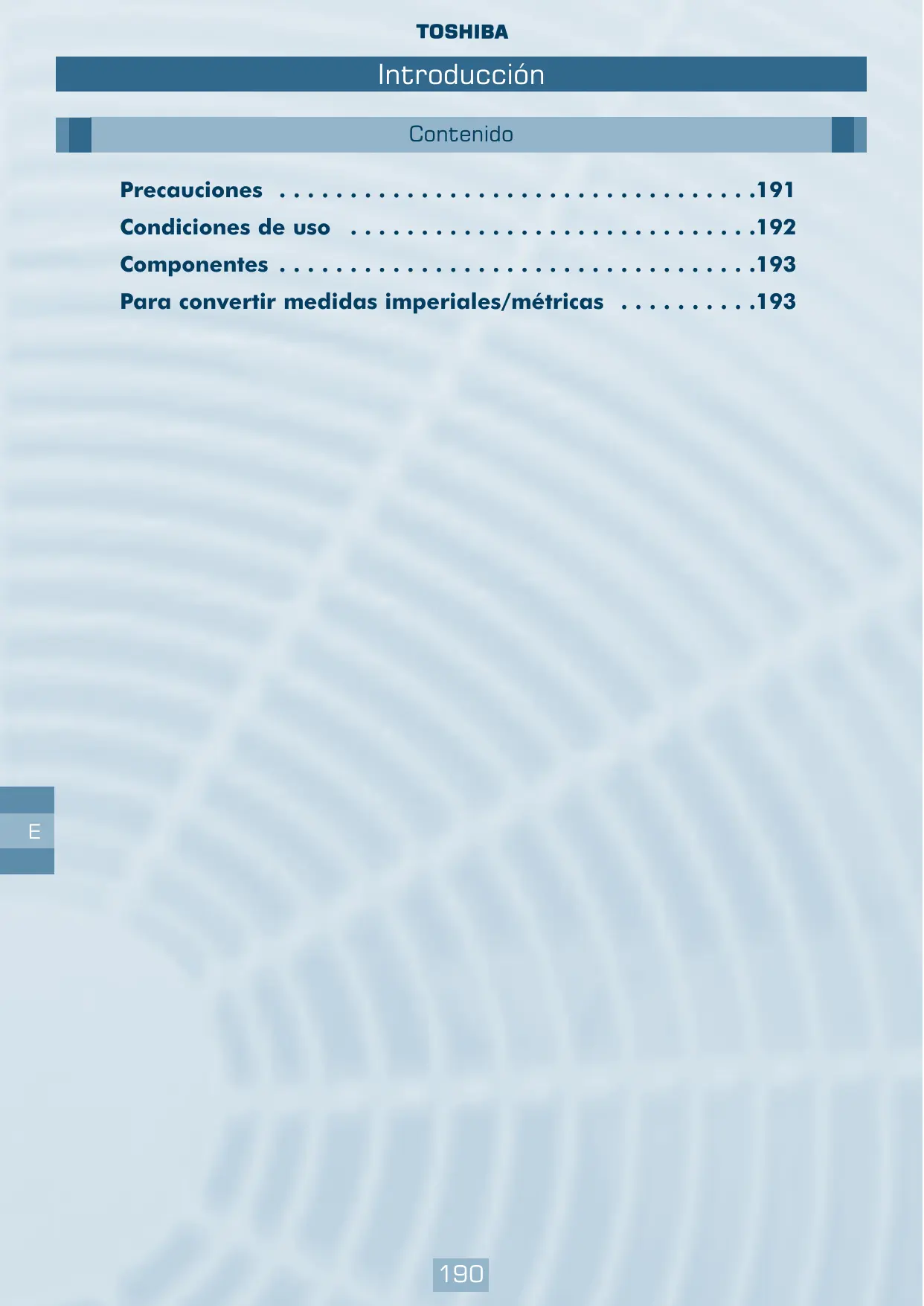Contenido Precauciones ssssssee 191 Condiciones de uso 192 Componentes sscssesose 193 Para convertir medidas imperiales/métricas 193