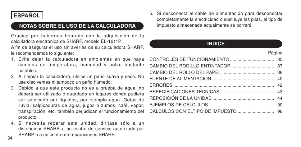 ESPAÑOL NOTAS SOBRE EL USO DE LA CALCULADORA Gracias por habernos honrado con la adquisición de la calculadora electrónica de SHARP, modelo EL-1611P. A fin de asegurar el uso sin averías de su calculadora SHARP, le recomendamos lo siguiente: 1. Evite dejar la calculadora en ambientes en que haya cambios de temperatura, humedad y polvo bastante notables. 2. Al limpiar la calculadora, utilice un paño suave y seco. No use disolventes ni tampoco un paño húmedo. 3. Debido a que este producto no es a prueba de agua, no deberá ser utilizado o guardado en lugares donde pudiera ser salpicado por líquidos, por ejemplo agua. Gotas de lluvia, salpicaduras de agua, jugos o zumos, café, vapor, transpiración, etc. también perjudican el funcionamiento del producto. 4. Si necesita reparar esta unidad, dirijase sólo a un distribuidor SHARP, a un centro de servicio autorizado por SHARP o a un centro de reparaciones SHARP. 34