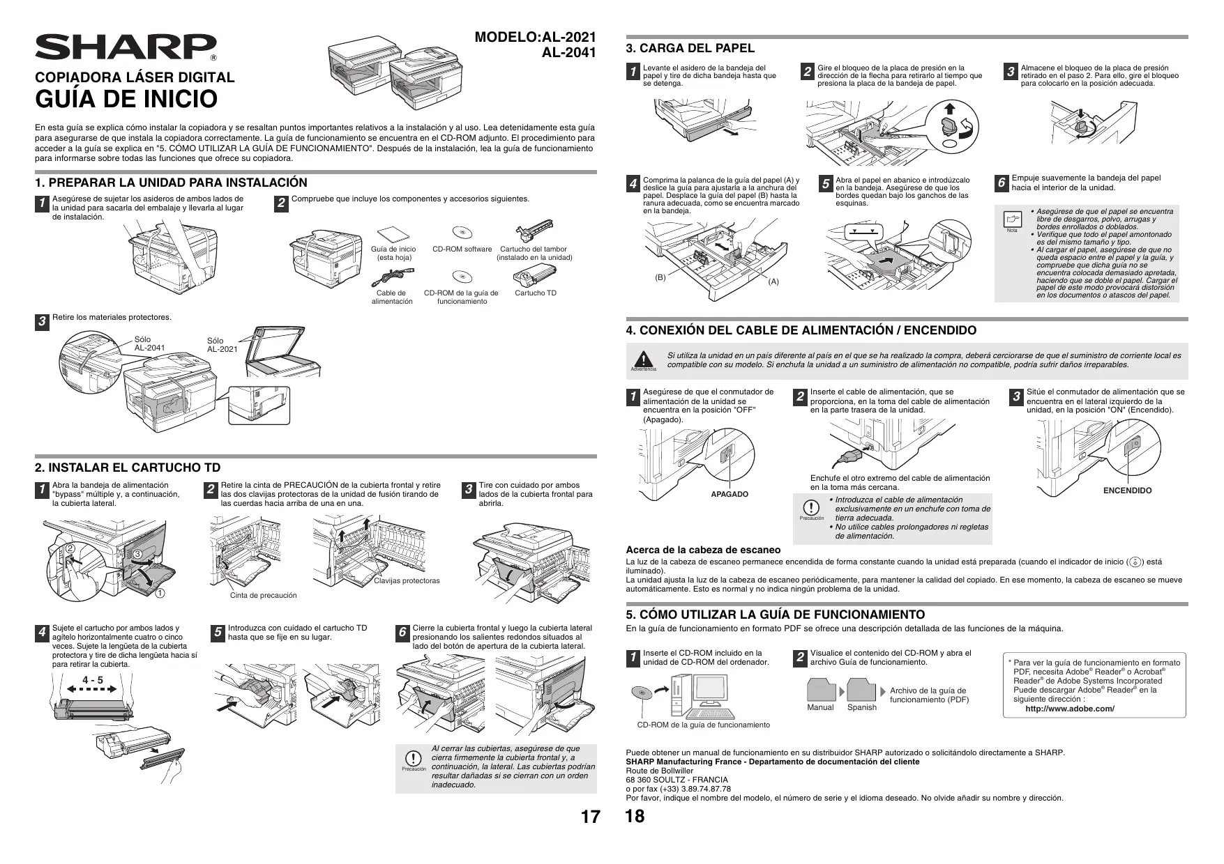 SHARP Manufacturing France - Departamento de documentación del cliente Route de Bollwiller 68 360 SOULTZ - FRANCIA o por fax (+33) 3.89.74.87.78 Por favor, indique el nombre del modelo, el número de serie y el idioma deseado. No olvide añadir su nombre y dirección.
