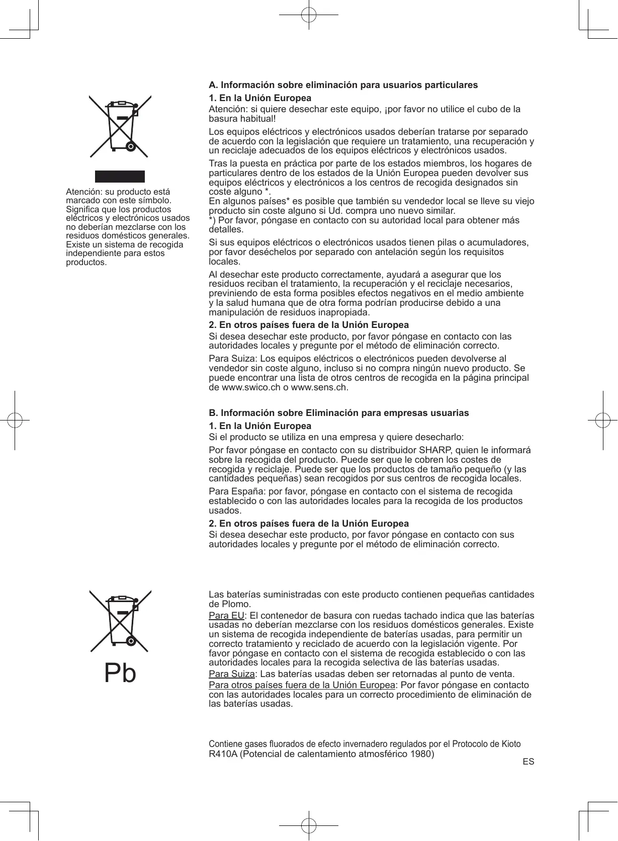 A. Información sobre eliminación para usuarios particulares 1. En la Unión Europea Atención: si quiere desechar este equipo, ¡por favor no utilice el cubo de la basura habitual! Los equipos eléctricos y electrónicos usados deberían tratarse por separado de acuerdo con la legislación que requiere un tratamiento, una recuperación y un reciclaje adecuados de los equipos eléctricos y electrónicos usados. Tras la puesta en práctica por parte de los estados miembros, los hogares de particulares dentro de los estados de la Unión Europea pueden devolver sus equipos eléctricos y electrónicos a los centros de recogida designados sin coste alguno *. En algunos países* es posible que también su vendedor local se lleve su viejo producto sin coste alguno si Ud. compra uno nuevo similar. *) Por favor, póngase en contacto con su autoridad local para obtener más detalles. Si sus equipos eléctricos o electrónicos usados tienen pilas o acumuladores, por favor deséchelos por separado con antelación según los requisitos locales. Al desechar este producto correctamente, ayudará a asegurar que los residuos reciban el tratamiento, la recuperación y el reciclaje necesarios, previniendo de esta forma posibles efectos negativos en el medio ambiente y la salud humana que de otra forma podrían producirse debido a una manipulación de residuos inapropiada. 2. En otros países fuera de la Unión Europea Si desea desechar este producto, por favor póngase en contacto con las autoridades locales y pregunte por el método de eliminación correcto. Para Suiza: Los equipos eléctricos o electrónicos pueden devolverse al vendedor sin coste alguno, incluso si no compra ningún nuevo producto. Se puede encontrar una lista de otros centros de recogida en la página principal de www.swico.ch o www.sens.ch. B. Información sobre Eliminación para empresas usuarias 1. En la Unión Europea Si el producto se utiliza en una empresa y quiere desecharlo: Por favor póngase en contacto con su distribuidor SHARP, quien le informará sobre la recogida del producto. Puede ser que le cobren los costes de recogida y reciclaje. Puede ser que los productos de tamaño pequeño (y las cantidades pequeñas) sean recogidos por sus centros de recogida locales. Para España: por favor, póngase en contacto con el sistema de recogida establecido o con las autoridades locales para la recogida de los productos usados. 2. En otros países fuera de la Unión Europea Si desea desechar este producto, por favor póngase en contacto con sus autoridades locales y pregunte por el método de eliminación correcto.