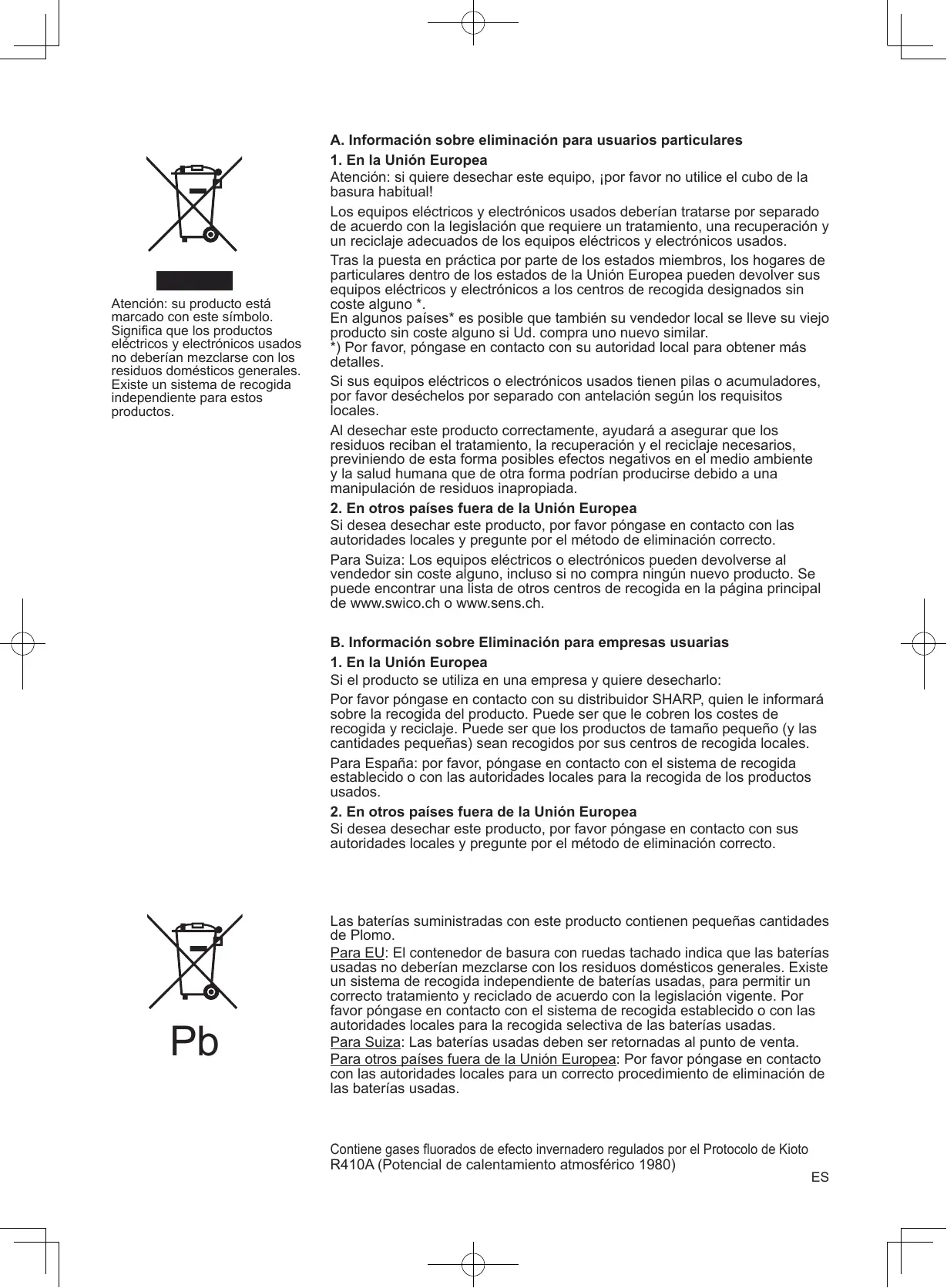 A. Información sobre eliminación para usuarios particulares 1. En la Unión Europea Atención: si quiere desechar este equipo, ¡por favor no utilice el cubo de la basura habitual! Los equipos eléctricos y electrónicos usados deberían tratarse por separado de acuerdo con la legislación que requiere un tratamiento, una recuperación y un reciclaje adecuados de los equipos eléctricos y electrónicos usados. Tras la puesta en práctica por parte de los estados miembros, los hogares de particulares dentro de los estados de la Unión Europea pueden devolver sus equipos eléctricos y electrónicos a los centros de recogida designados sin coste alguno *. En algunos países* es posible que también su vendedor local se lleve su viejo producto sin coste alguno si Ud. compra uno nuevo similar. *) Por favor, póngase en contacto con su autoridad local para obtener más detalles. Si sus equipos eléctricos o electrónicos usados tienen pilas o acumuladores, por favor deséchelos por separado con antelación según los requisitos locales. Al desechar este producto correctamente, ayudará a asegurar que los residuos reciban el tratamiento, la recuperación y el reciclaje necesarios, previniendo de esta forma posibles efectos negativos en el medio ambiente y la salud humana que de otra forma podrían producirse debido a una manipulación de residuos inapropiada. 2. En otros países fuera de la Unión Europea Si desea desechar este producto, por favor póngase en contacto con las autoridades locales y pregunte por el método de eliminación correcto. Para Suiza: Los equipos eléctricos o electrónicos pueden devolverse al vendedor sin coste alguno, incluso si no compra ningún nuevo producto. Se puede encontrar una lista de otros centros de recogida en la página principal de www.swico.ch o www.sens.ch. B. Información sobre Eliminación para empresas usuarias 1. En la Unión Europea Si el producto se utiliza en una empresa y quiere desecharlo: Por favor póngase en contacto con su distribuidor SHARP, quien le informará sobre la recogida del producto. Puede ser que le cobren los costes de recogida y reciclaje. Puede ser que los productos de tamaño pequeño (y las cantidades pequeñas) sean recogidos por sus centros de recogida locales. Para España: por favor, póngase en contacto con el sistema de recogida establecido o con las autoridades locales para la recogida de los productos usados. 2. En otros países fuera de la Unión Europea Si desea desechar este producto, por favor póngase en contacto con sus autoridades locales y pregunte por el método de eliminación correcto.