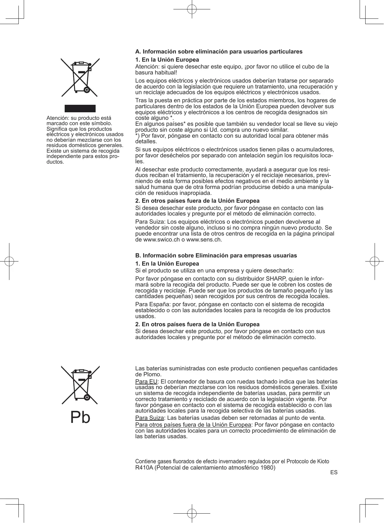 A. Información sobre eliminación para usuarios particulares 1. En la Unión Europea Atención: si quiere desechar este equipo, ¡por favor no utilice el cubo de la basura habitual! Los equipos eléctricos y electrónicos usados deberían tratarse por separado de acuerdo con la legislación que requiere un tratamiento, una recuperación y un reciclaje adecuados de los equipos eléctricos y electrónicos usados. Tras la puesta en práctica por parte de los estados miembros, los hogares de particulares dentro de los estados de la Unión Europea pueden devolver sus equipos eléctricos y electrónicos a los centros de recogida designados sin coste alguno *. En algunos países* es posible que también su vendedor local se lleve su viejo producto sin coste alguno si Ud. compra uno nuevo similar. *) Por favor, póngase en contacto con su autoridad local para obtener más detalles. Si sus equipos eléctricos o electrónicos usados tienen pilas o acumuladores, por favor deséchelos por separado con antelación según los requisitos locales. Al desechar este producto correctamente, ayudará a asegurar que los residuos reciban el tratamiento, la recuperación y el reciclaje necesarios, previniendo de esta forma posibles efectos negativos en el medio ambiente y la salud humana que de otra forma podrían producirse debido a una manipulación de residuos inapropiada. 2. En otros países fuera de la Unión Europea Si desea desechar este producto, por favor póngase en contacto con las autoridades locales y pregunte por el método de eliminación correcto. Para Suiza: Los equipos eléctricos o electrónicos pueden devolverse al vendedor sin coste alguno, incluso si no compra ningún nuevo producto. Se puede encontrar una lista de otros centros de recogida en la página principal de www.swico.ch o www.sens.ch. B. Información sobre Eliminación para empresas usuarias 1. En la Unión Europea Si el producto se utiliza en una empresa y quiere desecharlo: Por favor póngase en contacto con su distribuidor SHARP, quien le informará sobre la recogida del producto. Puede ser que le cobren los costes de recogida y reciclaje. Puede ser que los productos de tamaño pequeño (y las cantidades pequeñas) sean recogidos por sus centros de recogida locales. Para España: por favor, póngase en contacto con el sistema de recogida establecido o con las autoridades locales para la recogida de los productos usados. 2. En otros países fuera de la Unión Europea Si desea desechar este producto, por favor póngase en contacto con sus autoridades locales y pregunte por el método de eliminación correcto.