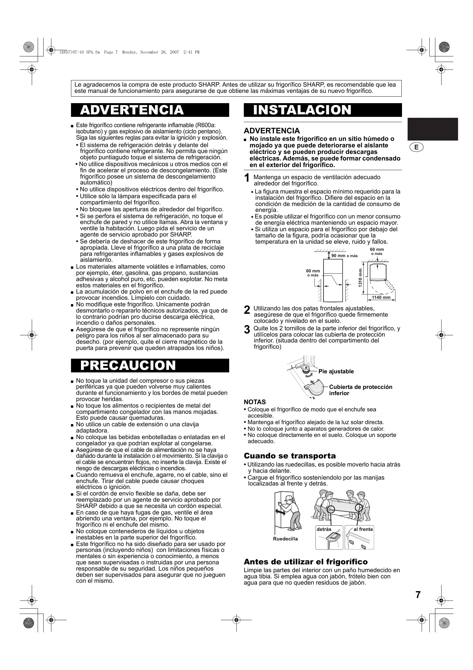 Le agradecemos la compra de este producto SHARP. Antes de utilizar su frigorífico SHARP, es recomendable que lea este manual de funcionamiento para asegurarse de que obtiene las máximas ventajas de su nuevo frigorífico.