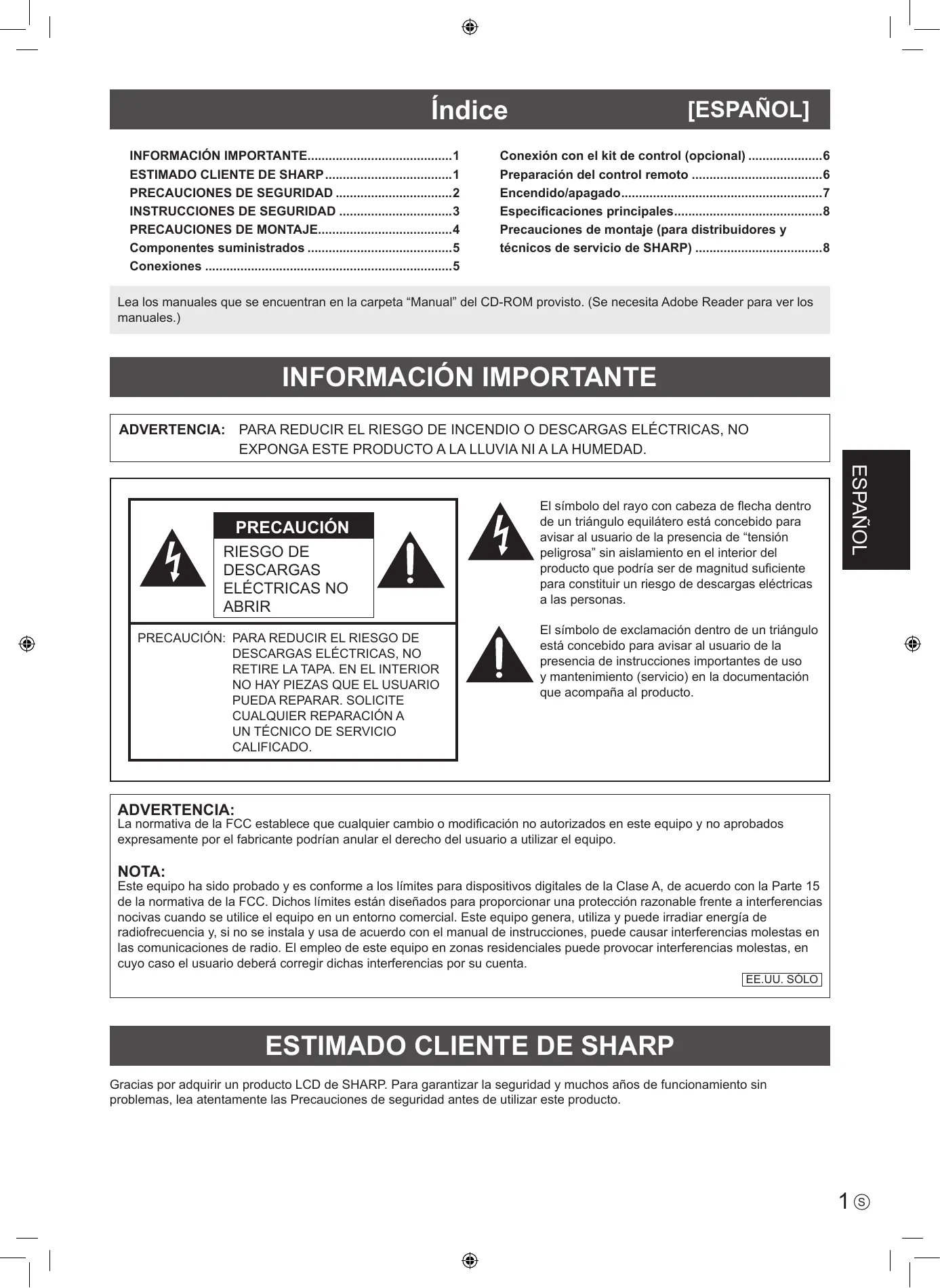 EE.UU. SÓLO ESTIMADO CLIENTE DE SHARP Gracias por adquirir un producto LCD de SHARP. Para garantizar la seguridad y muchos años de funcionamiento sin problemas, lea atentamente las Precauciones de seguridad antes de utilizar este producto.