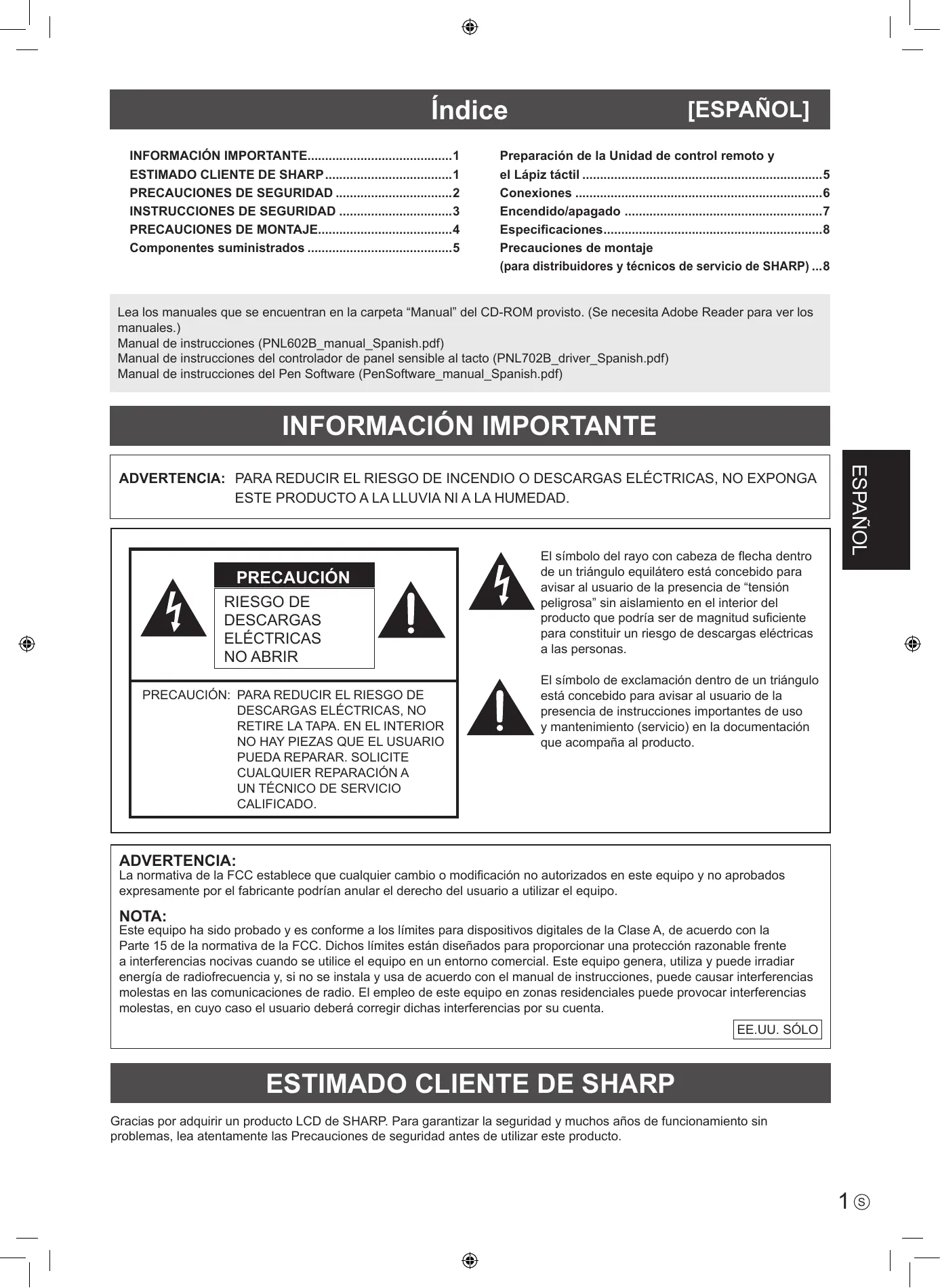 EE.UU. SÓLO ESTIMADO CLIENTE DE SHARP Gracias por adquirir un producto LCD de SHARP. Para garantizar la seguridad y muchos años de funcionamiento sin problemas, lea atentamente las Precauciones de seguridad antes de utilizar este producto.