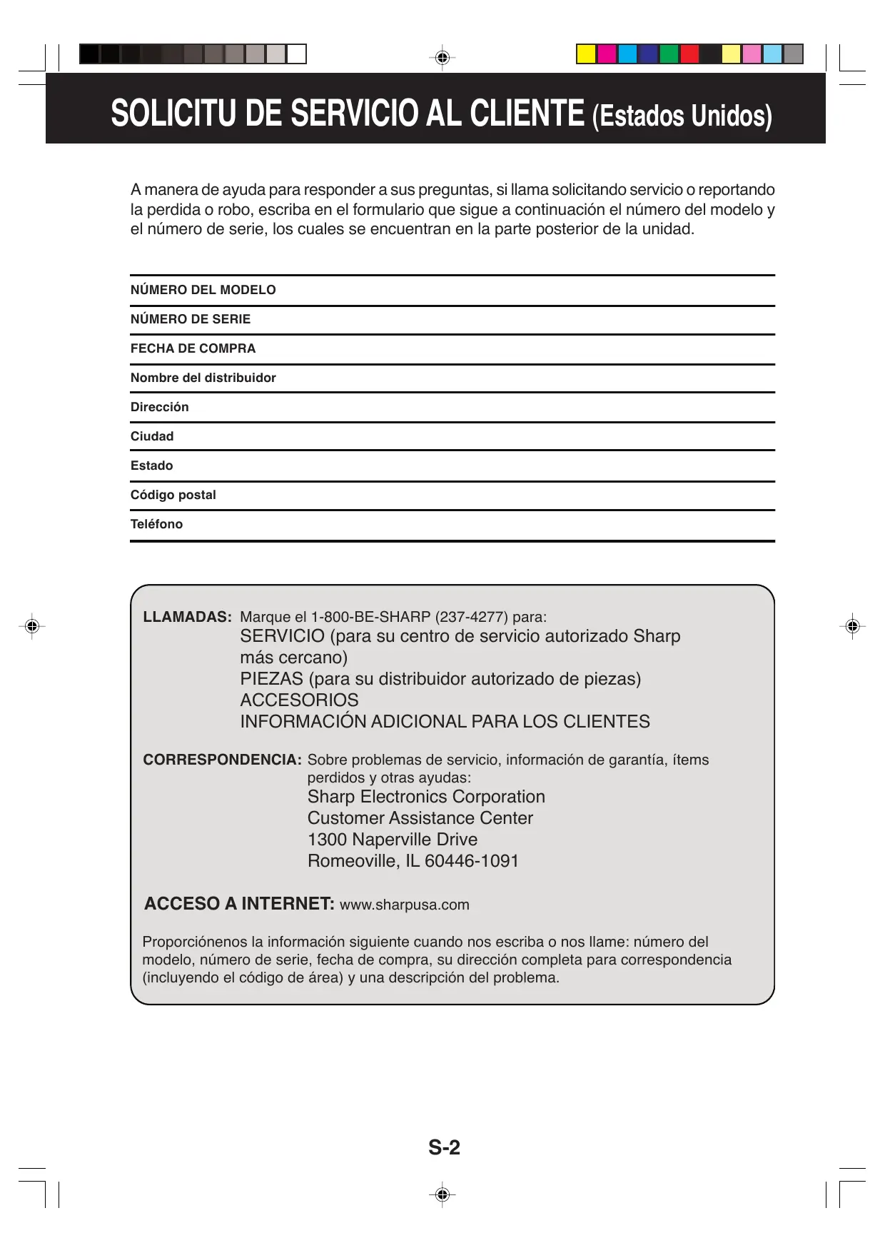 ACCESORIOS INFORMACIÔN ADICIONAL PARA LOS CLIENTES CORRESPONDENCIA: Sobre problemas de servicio, informaciôn de garantia, items perdidos y otras ayudas: Sharp Electronics Corporation Customer Assistance Center 1300 Naperville Drive Romeoville, IL 60446-1091