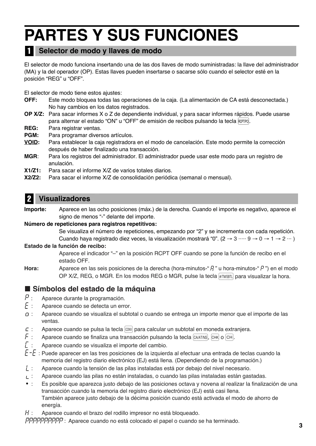 ü Selector de modo y Ilaves de modo El selector de modo funciona insertando una de las dos llaves de modo suministradas: la Ilave del administrador (MA) y la del operador (OP). Estas Ilaves pueden insertarse o sacarse sélo cuando el selector esté en la posiciôn “REG” u “OFF”. El selector de modo tiene estos ajustes: OFF: Este modo bloquea todas las operaciones de la caja. (La alimentacién de CA estä desconectada.) No hay cambios en los datos registrados. OP X/Z: Para sacar informes X o Z de dependiente individual, y para sacar informes râpidos. Puede usarse para alternar el estado “ON” u “OFF” de emisiôn de recibos pulsando la tecla foPTr0. REG: Para registrar ventas. PGM: Para programar diversos articulos. VOID: Para establecer la caja registradora en el modo de cancelaciôn. Este modo permite la correcciôn después de haber finalizado una transacciôn. MGR: Para los registros del administrador. El administrador puede usar este modo para un registro de anulaciôn. X1/Z1: Para sacar el informe X/Z de varios totales diarios. X2/Z2: Para sacar el informe X/Z de consolidaciôn periédica (semanal o mensual). A visuaizadores Importe: Aparece en las ocho posiciones (mäx.) de la derecha. Cuando el importe es negativo, aparece el signo de menos “-” delante del importe. Nümero de repeticiones para registros repetitivos: Se visualiza el nümero de repeticiones, empezando por “2” y se incrementa con cada repeticiôn. Cuando haya registrado diez veces, la visualizacién mostrarä “0”. (2 — 3 9—0—1—2.--) Estado de la funcién de recibo: Aparece el indicador estado OFF. Hora: Aparece en las seis posiciones de la derecha (hora-minutos-“ A” u hora-minutos-“ A") en el modo OP X/Z, REG, o MGR. En los modos REG o MGR, pulse la tecla 1} para visualizar la hora. en la posicién RCPT OFF cuando se pone la funcién de recibo en el HE Simbolos del estado de la mâquina P: Aparece durante la programaciôn. £: Aparece cuando se detecta un error. O: Aparece cuando se visualiza el subtotal o cuando se entrega un importe menor que el importe de las ventas. £: Aparece cuando se pulsa la tecla {ou para calcular un subtotal en moneda extranjera. FE: Aparece cuando se finaliza una transacciôn pulsando la tecla CHK o [CH] C: Aparece cuando se visualiza el importe del cambio. E-E : Puede aparecer en las tres posiciones de la izquierda al efectuar una entrada de teclas cuando la memoria del registro diario electrénico (EJ) est4 Ilena. (Dependiendo de la programacién.) L Aparece cuando la tensiôn de las pilas instaladas est por debajo del nivel necesario. L: Aparece cuando las pilas no estän instaladas, o cuando las pilas instaladas estân gastadas. . Es posible que aparezca justo debajo de las posiciones octava y novena al realizar la finalizaciôn de una transacciôn cuando la memoria del registro diario electrénico (EJ) estä casi llena. También aparece justo debajo de la décima posiciôn cuando estä activada el modo de ahorro de energia. H: Aparece cuando el brazo del rodillo impresor no estä bloqueado. PPPPAPPPPP : Aparece cuando no est colocado el papel o cuando se ha terminado.