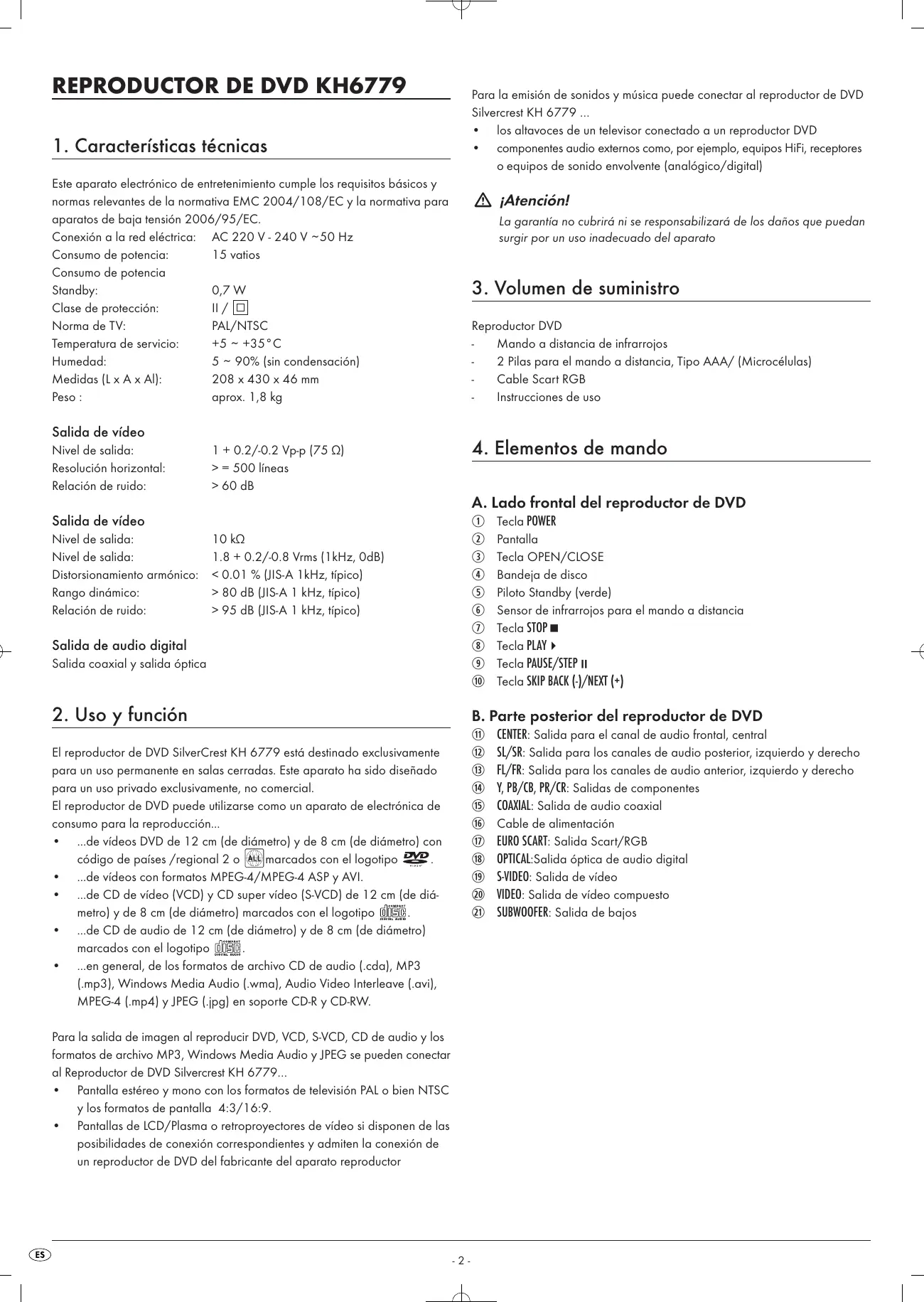 2. Uso y funcién B. Parte posterior del reproductor de DVD CENTER: Salida para el canal de audio frontal, central El reproductor de DVD SilverCrest KH 6779 esté destinado exclusivamente para un uso permanente en salas cerradas. Este aparato ha sido diseñado