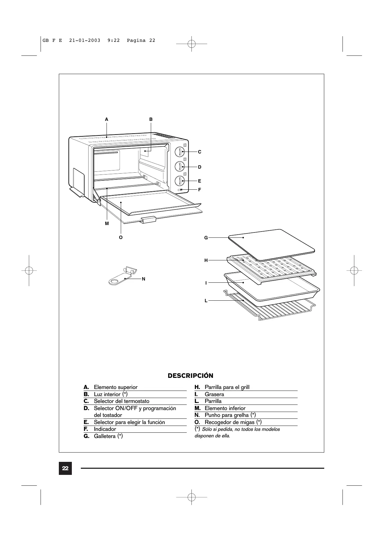 - Si consta de ella, la luz interior (B) se queda siempre encendida cuando elorno está en la posicion ON. El indicator (F) se apaga cuando el interior del hora alcanza la temperatura de cocccion deseada, bajo se enciende y se apaga de vez en cuando durante la cocccion.