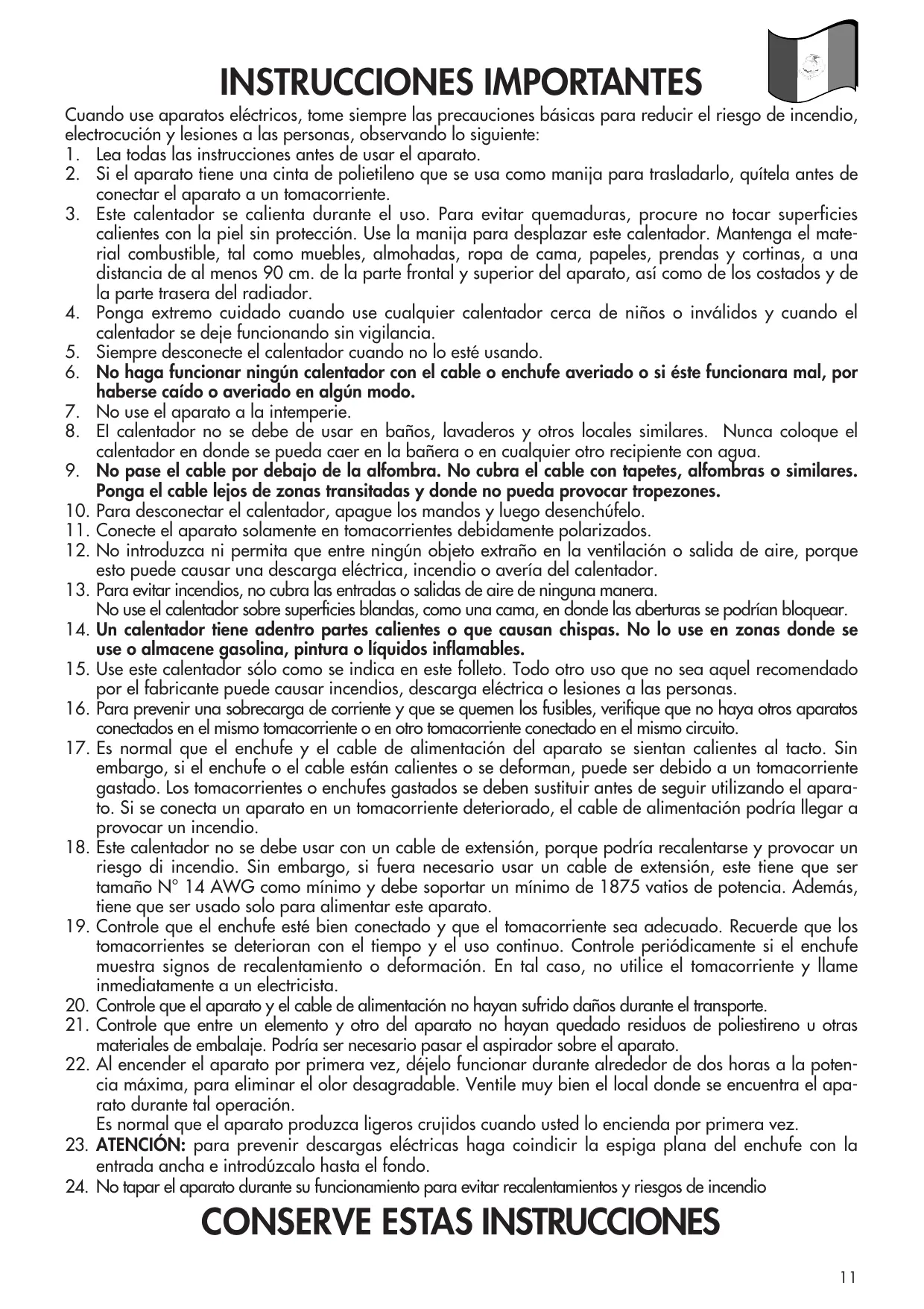 INSTRUCCIONES IMPORTANTES Cuando use aparatos eléctricos, tome siempre las precauciones básicas para reducir el riesgo de incendio, electrocución y lesiones a las personas, observando lo siguiente: 1. Lea todas las instrucciones antes de usar el aparato. 2. Si el aparato tiene una cinta de polietileno que se usa como manija para trasladarlo, quítela antes de conectar el aparato a un tomacorriente. 3. Este calentador se calienta durante el uso. Para evitar quemaduras, procure no tocar superficies calientes con la piel sin protección. Use la manija para desplazar este calentador. Mantenga el material combustible, tal como muebles, almohadas, ropa de cama, papeles, prendas y cortinas, a una distancia de al menos 90 cm. de la parte frontal y superior del aparato, así como de los costados y de la parte trasera del radiador. 4. Ponga extremo cuidado cuando use cualquier calentador cerca de niños o inválidos y cuando el calentador se deje funcionando sin vigilancia. 5. Siempre desconecte el calentador cuando no lo esté usando. 6. No haga funcionar ningún calentador con el cable o enchufe averiado o si éste funcionara mal, por haberse caído o averiado en algún modo. 7. No use el aparato a la intemperie. 8. EI calentador no se debe de usar en baños, lavaderos y otros locales similares. Nunca coloque el calentador en donde se pueda caer en la bañera o en cualquier otro recipiente con agua. 9. No pase el cable por debajo de la alfombra. No cubra el cable con tapetes, alfombras o similares. Ponga el cable lejos de zonas transitadas y donde no pueda provocar tropezones. 10. Para desconectar el calentador, apague los mandos y luego desenchúfelo. 11. Conecte el aparato solamente en tomacorrientes debidamente polarizados. 12. No introduzca ni permita que entre ningún objeto extraño en la ventilación o salida de aire, porque esto puede causar una descarga eléctrica, incendio o avería del calentador. 13. Para evitar incendios, no cubra las entradas o salidas de aire de ninguna manera. No use el calentador sobre superficies blandas, como una cama, en donde las aberturas se podrían bloquear. 14. Un calentador tiene adentro partes calientes o que causan chispas. No lo use en zonas donde se use o almacene gasolina, pintura o líquidos inflamables. 15. Use este calentador sólo como se indica en este folleto. Todo otro uso que no sea aquel recomendado por el fabricante puede causar incendios, descarga eléctrica o lesiones a las personas. 16. Para prevenir una sobrecarga de corriente y que se quemen los fusibles, verifique que no haya otros aparatos conectados en el mismo tomacorriente o en otro tomacorriente conectado en el mismo circuito. 17. Es normal que el enchufe y el cable de alimentación del aparato se sientan calientes al tacto. Sin embargo, si el enchufe o el cable están calientes o se deforman, puede ser debido a un tomacorriente gastado. Los tomacorrientes o enchufes gastados se deben sustituir antes de seguir utilizando el aparato. Si se conecta un aparato en un tomacorriente deteriorado, el cable de alimentación podría llegar a provocar un incendio. 18. Este calentador no se debe usar con un cable de extensión, porque podría recalentarse y provocar un riesgo di incendio. Sin embargo, si fuera necesario usar un cable de extensión, este tiene que ser tamaño N° 14 AWG como mínimo y debe soportar un mínimo de 1875 vatios de potencia. Además, tiene que ser usado solo para alimentar este aparato. 19. Controle que el enchufe esté bien conectado y que el tomacorriente sea adecuado. Recuerde que los tomacorrientes se deterioran con el tiempo y el uso continuo. Controle periódicamente si el enchufe muestra signos de recalentamiento o deformación. En tal caso, no utilice el tomacorriente y llame inmediatamente a un electricista. 20. Controle que el aparato y el cable de alimentación no hayan sufrido daños durante el transporte. 21. Controle que entre un elemento y otro del aparato no hayan quedado residuos de poliestireno u otras materiales de embalaje. Podría ser necesario pasar el aspirador sobre el aparato. 22. Al encender el aparato por primera vez, déjelo funcionar durante alrededor de dos horas a la potencia máxima, para eliminar el olor desagradable. Ventile muy bien el local donde se encuentra el aparato durante tal operación. Es normal que el aparato produzca ligeros crujidos cuando usted lo encienda por primera vez. 23. ATENCIÓN: para prevenir descargas eléctricas haga coindicir la espiga plana del enchufe con la entrada ancha e introdúzcalo hasta el fondo. 24. No tapar el aparato durante su funcionamiento para evitar recalentamientos y riesgos de incendio