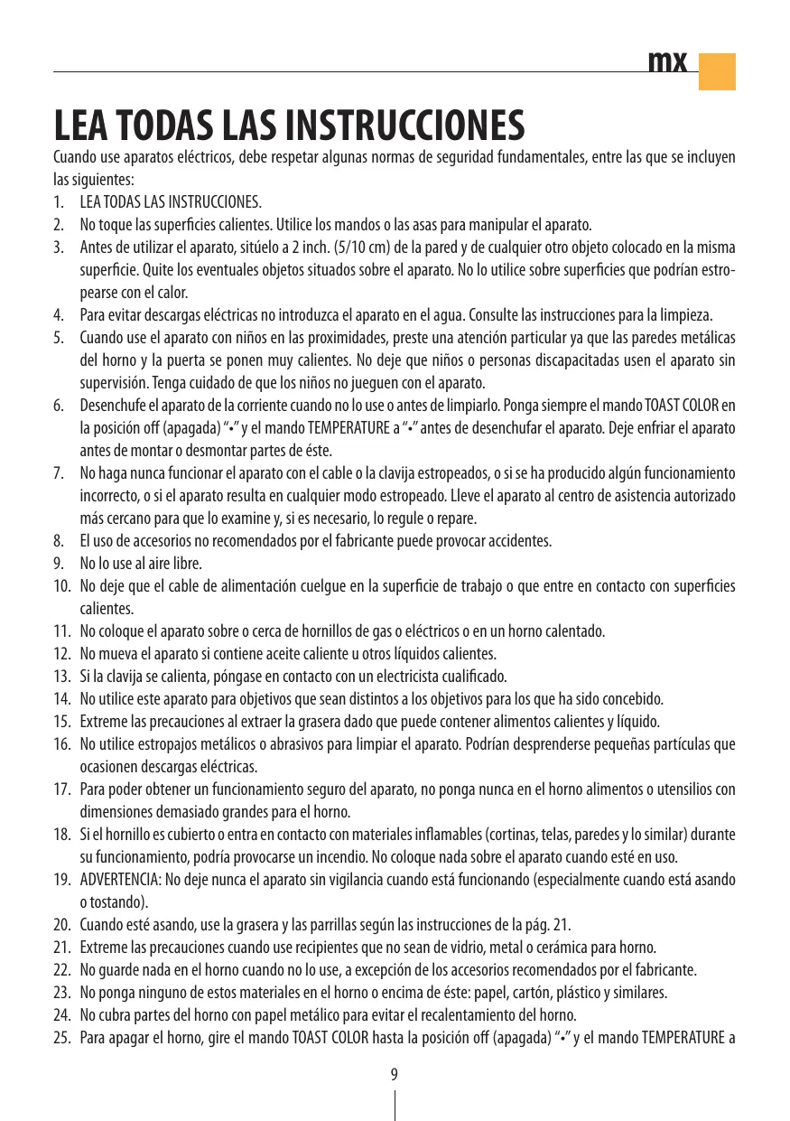 - Cuando use el aparato con niños en las proximidades, preste una atencion particular ya que las paredes metálicas del hora y la puerta se ponen muy calientes. No deje que niños o personas incapacitasadas usen el aparato sin supervisión. Tenga cuidado de que los niños no juguen con el aparato.