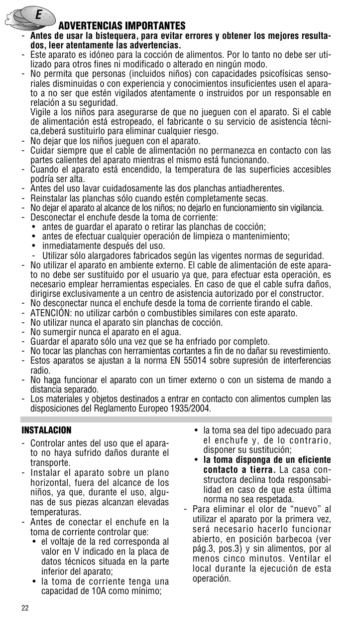 - inmediatamente después del uso. - Utilizar sólo alargadores fabricados según las vigentes normas de seguridad. - No utilizar el aparato en ambiente externo. El cable de alimentación de este aparato no debe ser sustituido por el usuario ya que, para efectuar esta operación, es necesario emplear herramientas especiales. En caso de que el cable sufra daños, dirigirse exclusivamente a un centro de asistencia autorizado por el constructor. - No desconectar nunca el enchufe desde la toma de corriente tirando el cable. - ATENCIÓN: no utilizar carbón o combustibles similares con este aparato. - No utilizar nunca el aparato sin planchas de cocción. - No sumergir nunca el aparato en el agua. - Guardar el aparato sólo una vez que se ha enfriado por completo. - No tocar las planchas con herramientas cortantes a fin de no dañar su revestimiento. - Estos aparatos se ajustan a la norma EN 55014 sobre supresión de interferencias radio. - No haga funcionar el aparato con un timer externo o con un sistema de mando a distancia separado. - Los materiales y objetos destinados a entrar en contacto con alimentos cumplen las disposiciones del Reglamento Europeo 1935/2004. INSTALACION - Controlar antes del uso que el aparato no haya sufrido daños durante el transporte. - Instalar el aparato sobre un plano horizontal, fuera del alcance de los niños, ya que, durante el uso, algunas de sus piezas alcanzan elevadas temperaturas. - Antes de conectar el enchufe en la toma de corriente controlar que: