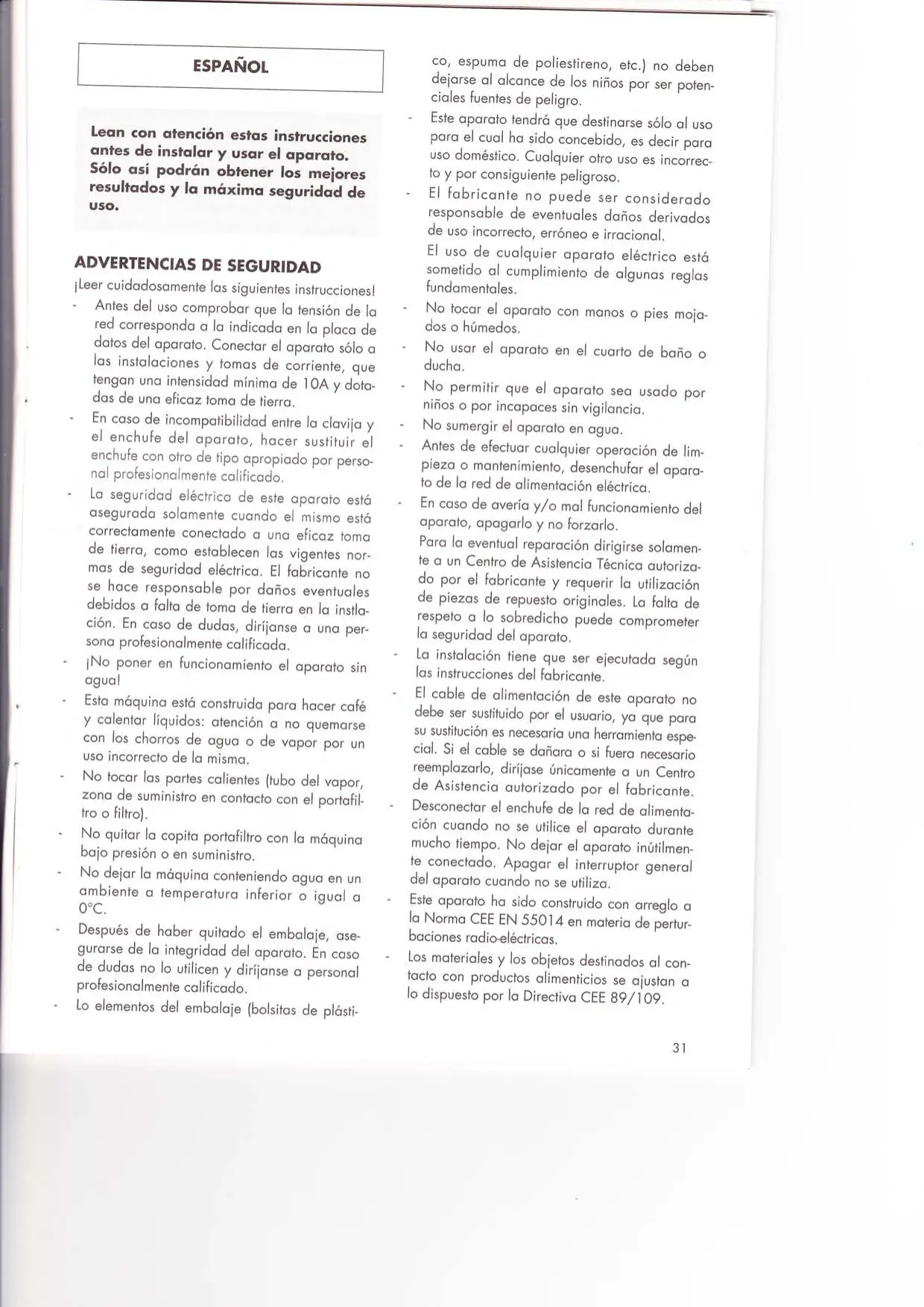Lo elementos del emboloie (bolsitos de plôsti- No sumergir el oporoto en oguo. Antes de efectuor cuolquier operociôn de limpiezo o montenimiento, desenchufor el oporoto de lo red de olimentociôn eléctrico. En coso de ove rîo y/o mol funcionomiento del oporoto, opogo rlo y no forzorlo. Poro lo eventuol reporociôn dirigirse solomente o un centro de Asistencio Técnico outorizo- respeto o lo sobredicho puede comprometer lo seguridod del oporoto. No tocor los portes colientes (tubo del voPor/ ombiente que el oporoto seo usodo por ifros o por incopoces sin vig iloncio. do por el fobriconte y requerir lo utilizociôn de piezos de repuesto originoles. Lo folto de Esto môquino estô construido poro hocer cofé y colentof liquidos: otenciôn o no quemorse zono de suministro en contocto con el portofiltro o filtro).