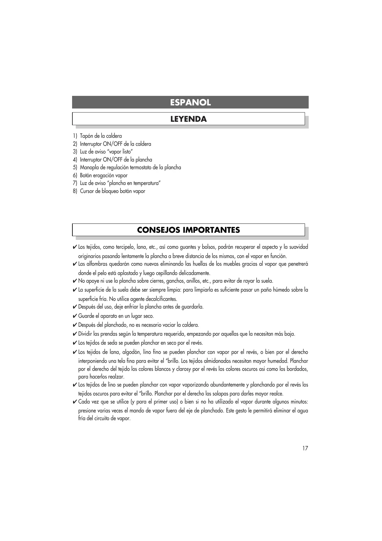 Tapón de la caldera Interruptor ON/OFF de la caldera Luz de aviso “vapor listo” Interruptor ON/OFF de la plancha Manopla de regulación termostato de la plancha Botón erogación vapor Luz de aviso “plancha en temperatura” Cursor de bloqueo botón vapor CONSEJOS IMPORTANTES ✔ Los tejidos, como tercipelo, lana, etc., así como guantes y bolsos, podrán recuperar el aspecto y la suavidad originarios pasando lentamente la plancha a breve distancia de los mismos, con el vapor en función. ✔ Las alfombras quedarán como nuevas eliminando las huellas de los muebles gracias al vapor que penetrerá donde el pelo está aplastado y luego cepillando delicadamente. ✔ No apoye ni use la plancha sobre cierres, ganchos, anillos, etc., para evitar de rayar la suela. ✔ La superficie de la suela debe ser siempre limpia: para limpiarla es suficiente pasar un paño húmedo sobre la superficie fría. No utilice agente decalcificantes. ✔ Después del uso, deje enfriar la plancha antes de guardarla. ✔ Guarde el aparato en un lugar seco. ✔ Después del planchado, no es necesario vaciar la caldera. ✔ Dividir las prendas según la temperatura requerida, empezando por aquellas que la necesitan más baja. ✔ Los tejidos de seda se pueden planchar en seco por el revés. ✔ Los tejidos de lana, algodón, lino fino se pueden planchar con vapor por el revés, o bien por el derecho interponiendo una tela fina para evitar el “brillo. Los tejidos almidonados necesitan mayor humedad. Planchar por el derecho del tejido los colores blancos y clarosy por el revés los colores oscuros asi como los bordados, para hacerlos realzar. ✔ Los tejidos de lino se pueden planchar con vapor vaporizando abundantemente y planchando por el revés los tejidos oscuros para evitar el “brillo. Planchar por el derecho las solapas para darles mayor realce. ✔ Cada vez que se utilice (y para el primer uso) o bien si no ha utilizado el vapor durante algunos minutos: presione varias veces el mando de vapor fuera del eje de planchado. Este gesto le permitirá eliminar el agua fría del circuito de vapor.