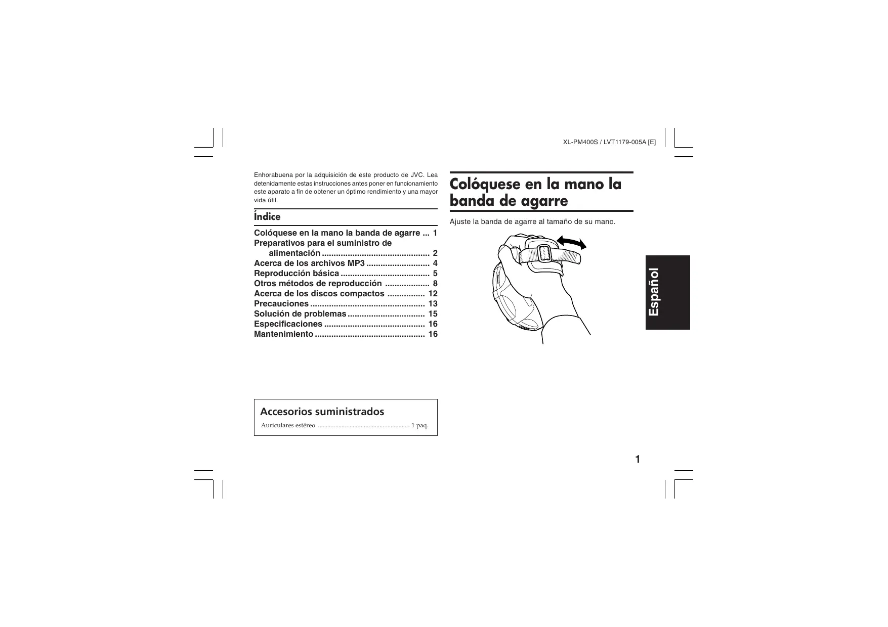 - Índice Colóquese en la mano la banda de agarre English Enhorabuena por la adquisición de este producto de JVC. Lea detenidamente estas instrucciones antes poner en funcionamiento este aparato a fin de obtener un óptimo rendimiento y una mayor vida útil. Ajuste la banda de agarre al tamaño de su mano. Nederlands Español Colóquese en la mano la banda de agarre p. 1