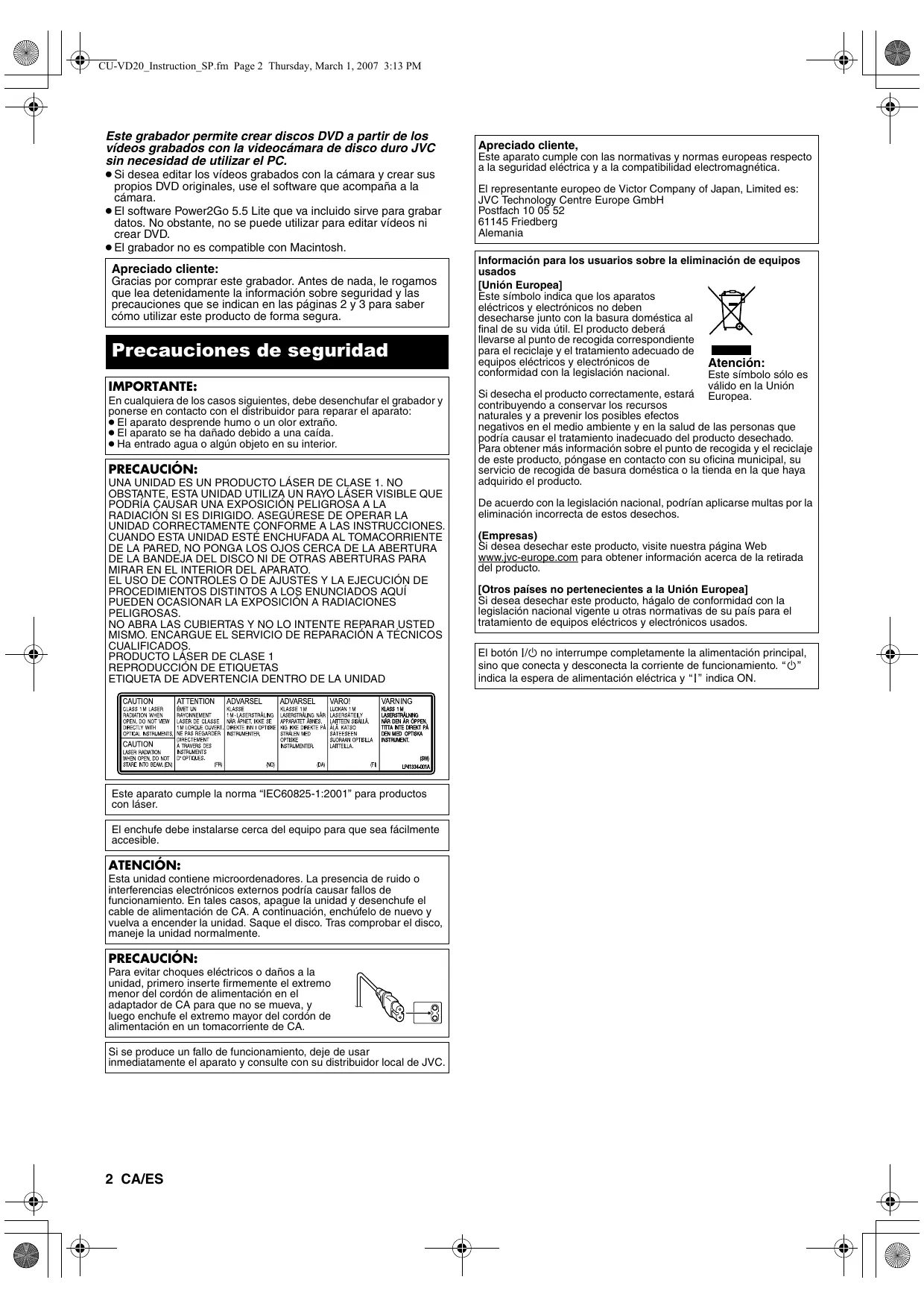 Grabador de DVD Grabador de DVD MANUAL DE INSTRUCCIONES SUOMI MANUAL DE INSTRUCCIONES Este grabador permite crear discos DVD a partir de los vídeos grabados con la videocámara de disco duro JVC sin necesidad de utilizar el PC.