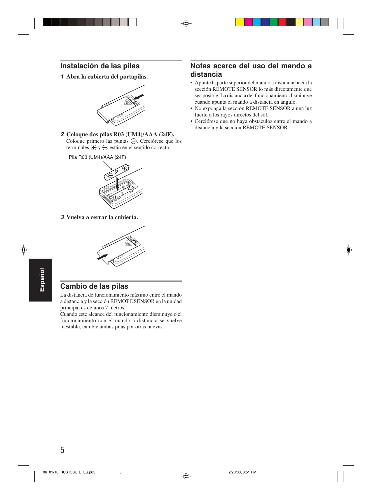 2/20/03, 6:51 PM Instalación de las pilas 1 Abra la cubierta del portapilas. Notas acerca del uso del mando a distancia